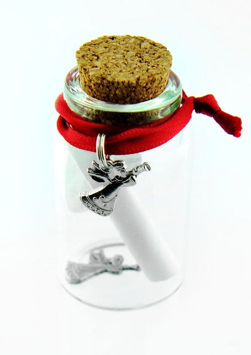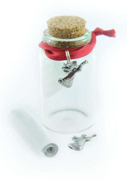 A message in a bottle featuring a small token to be tucked inside with your hand written note. Sitting about 2 inches tall, it comes complete with the paper to write your wish or prayer for your loved one.