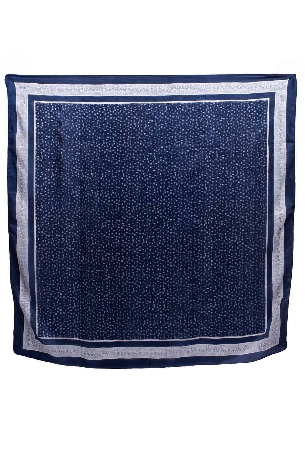 This design features a delicate ditsy pattern of tiny white motifs scattered across a rich navy background, framed with an elegant coordinating border. The subtle pattern and classic color palette create a refined, versatile look that pairs effortlessly with both casual and dressier outfits.