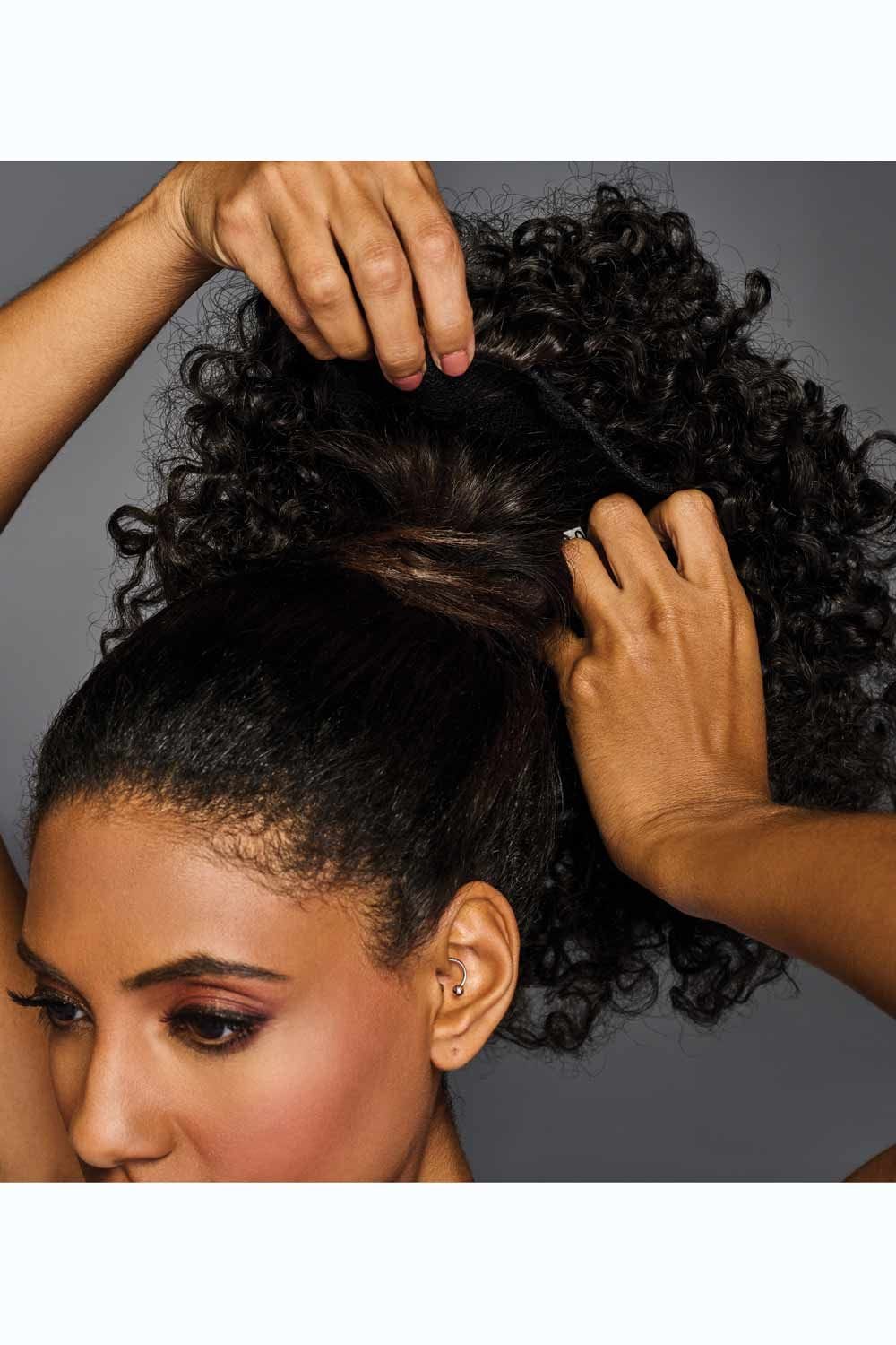The 16 Inch Coily Cinched Pony by Hairdo is an ultra curly ponytail that easily attaches to your own hair. The cinched pocket attachment protects your hair while giving you an instant boost of volume. The heat resistant synthetic hair has a light, soft texture that makes these perfected curls look fabulous and feel natural.
