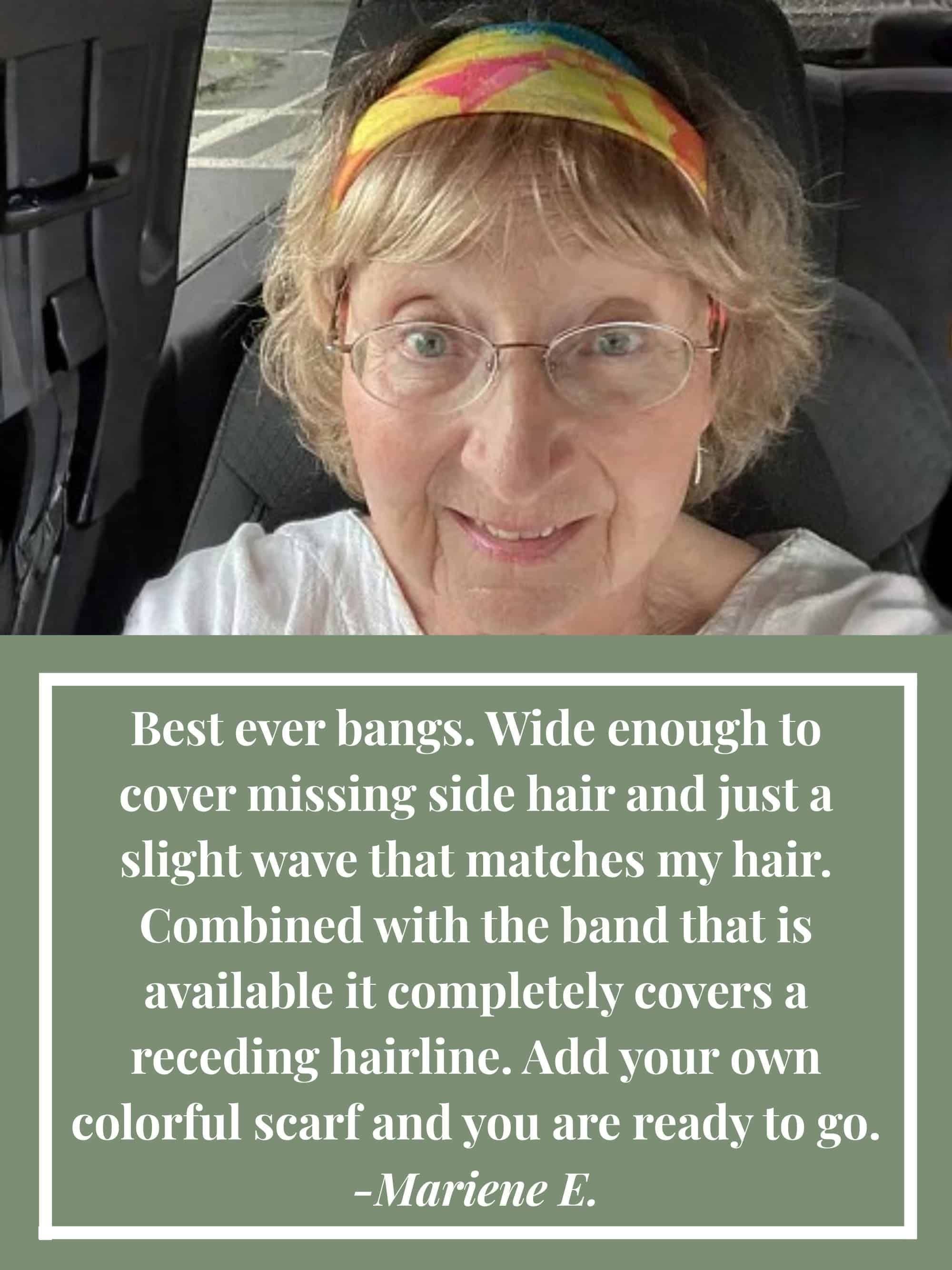 These extra wide bangs will attach inside any hat, turban or scarf. They are extremely natural looking and easy to use. Our 201 Extra Wide bangs offer full coverage of the forehead and give a few soft strands to cover the temple area. These bangs are perfect for women with hair loss due to cancer, chemotherapy, alopecia, or other medical hair loss conditions. Women love the natural look and feel of these bangs, as they are made from a fine synthetic material. The quality of our bangs is unsurpassed by anything on the market. The synthetic fiber used to make these bangs is soft and smooth to the touch. It is not itchy like some synthetic fibers can be. Our customers love the look and feel of these bangs and we know you will, too. All headwear is sold separately and is not included.