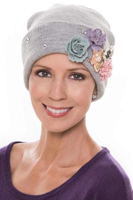 The traditional beanie gets a makeover in this adorable cap. Adelynn brings the bling with sparkling embellishments and colorful 3D flowers attached to its wide cuff. Easily move the two attached flower pins to a different part of the hat or fasten to a sweater for a snazzy, coordinating look. While this hat has the fit and feel of a basic beanie, it is anything but standard! Adelynn brings an outstanding collage of colors, textures, and finishes that will add a fashionable flair to anything it is paired with.