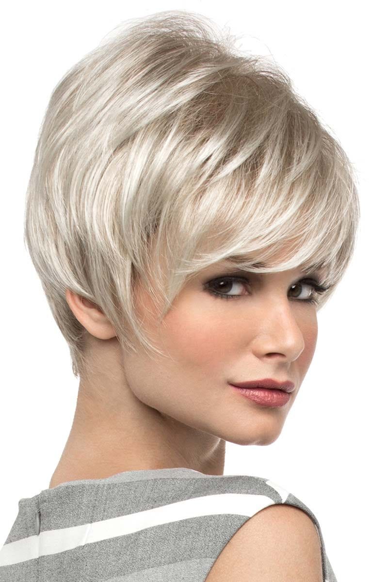 This fun and funky pixie cut features closely cropped layers and gentle wisp bangs with face framing tendrils. The layers in the back of this style are tapered at the nape for a stylish effect. Soft, medium length layers on the top and sides with short, razored layers in the back, work together to create a feminine look that can be fluffed up or smoothed down depending on your personal style preference. An open top cap design ensures the ultimate in comfort for this easy to wear style.