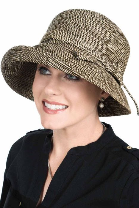 This elegant slanted bucket hat is fashioned in an ultra comfortable soft paper braid. It does not itch or scratch sensitive scalps. A mix or natural and black colored paper braid creates a neutral appearance that is ideal for wearing with just about any outfit! A band with a knot on the side completes the look. This style can be dressed up or dressed down depending on what you pair it with. Pair this versatile hat with your favorite outdoor wear for optimal sun protection. It's great for wearing with causal blouses, t-shirts and shorts, a sundress, or even a bathing suit! This cute hat has a lightweight feel that can't be beat! It provides a secure it that we just know you're going to love.