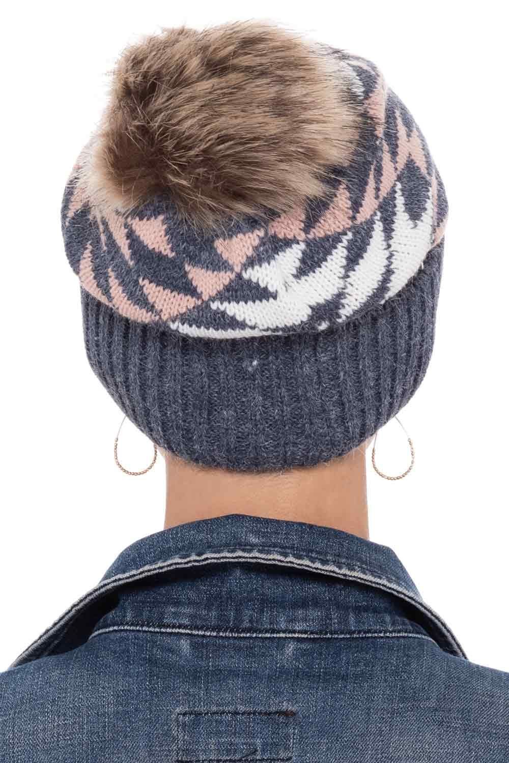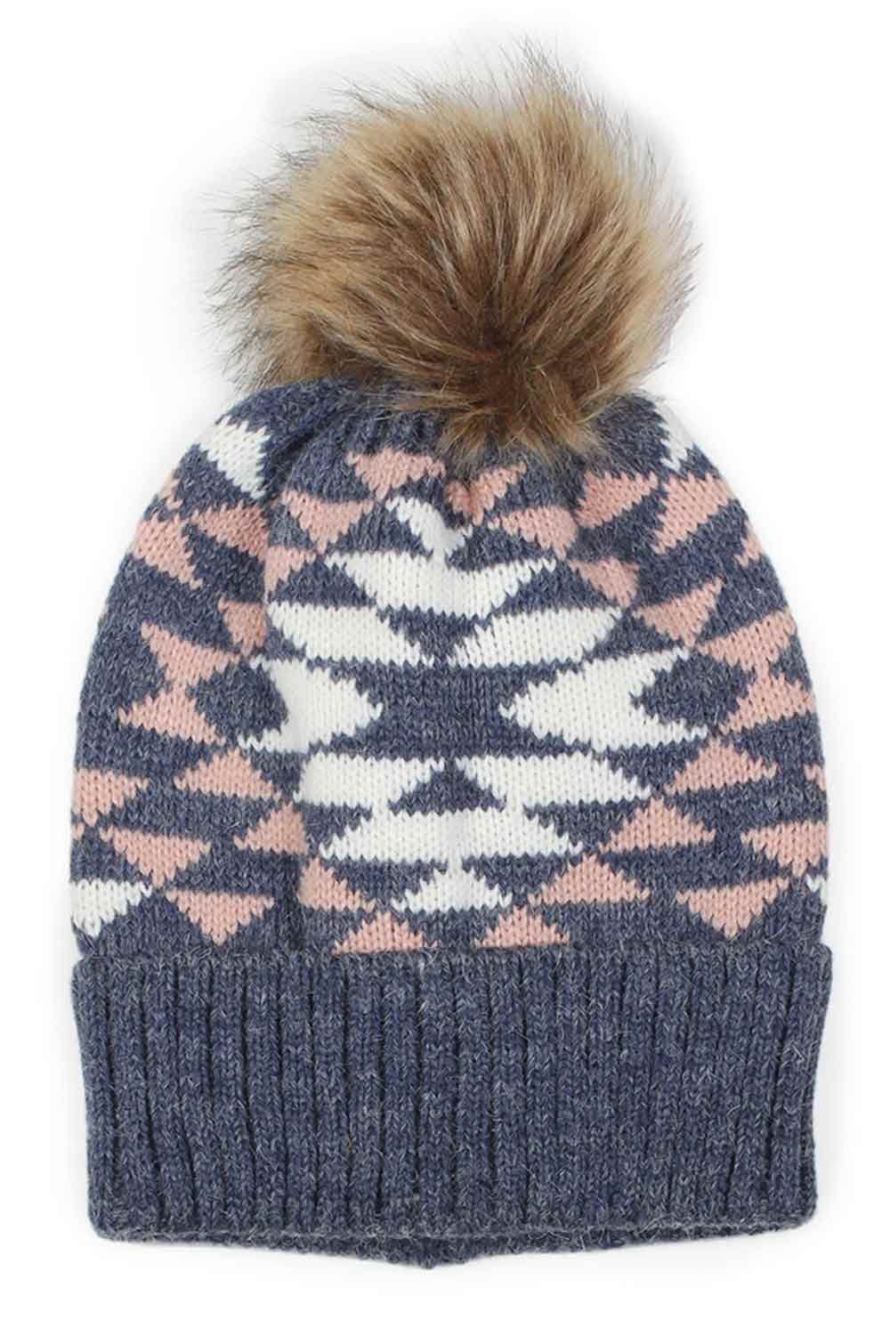 Aztec Faux Fur Pom-Pom Beanie Hat | Stylish Winter Beanie Hats for Women