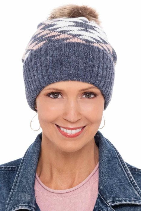 The Aztec Faux Fur Pom-Pom Beanie Hat features a beautiful design in denim, rose quartz pink, and creamy white. A faux fur pom-pom tops off this chic beanie hat. The added cuff provides extra warmth to the wearer's ears.