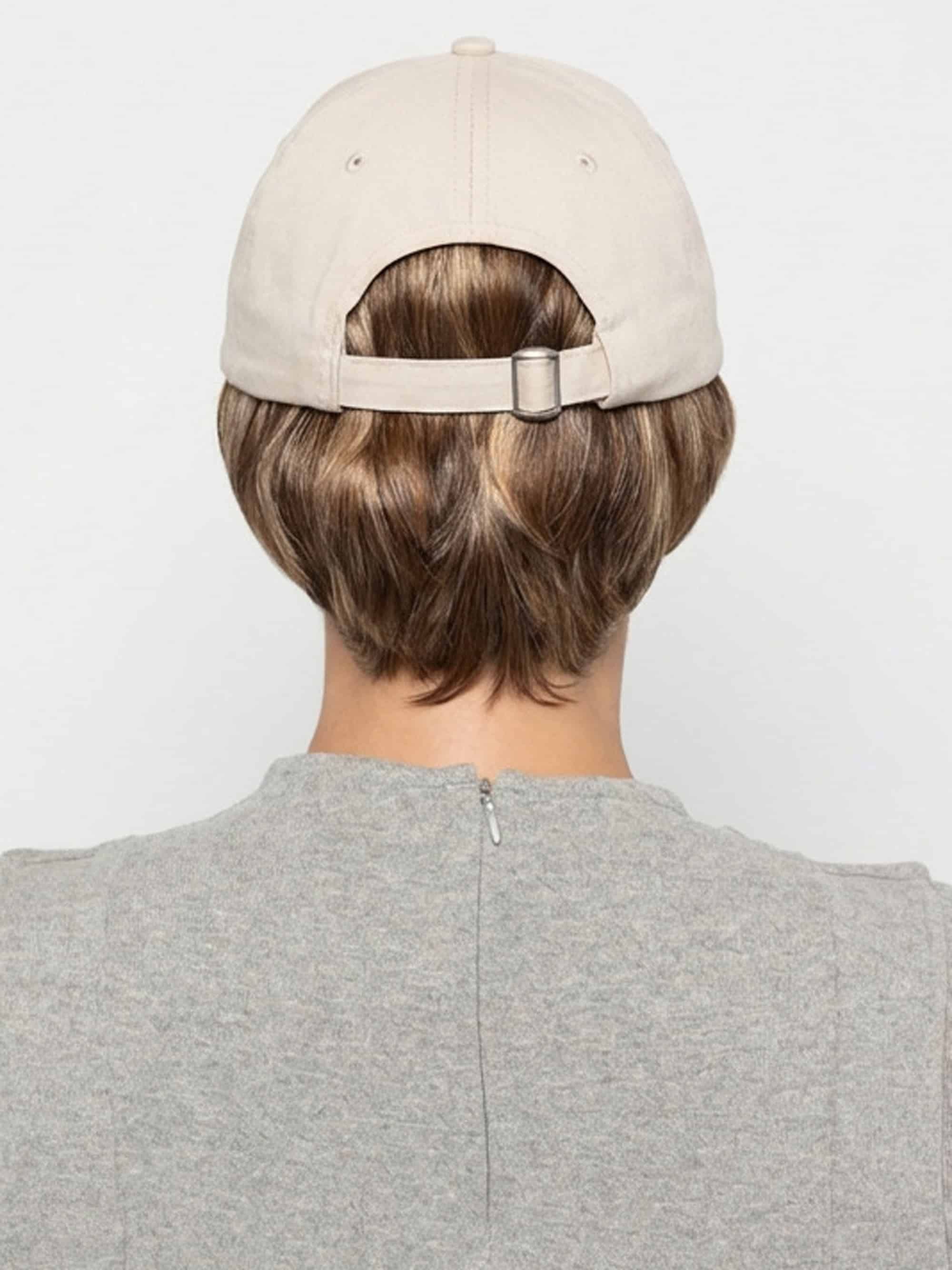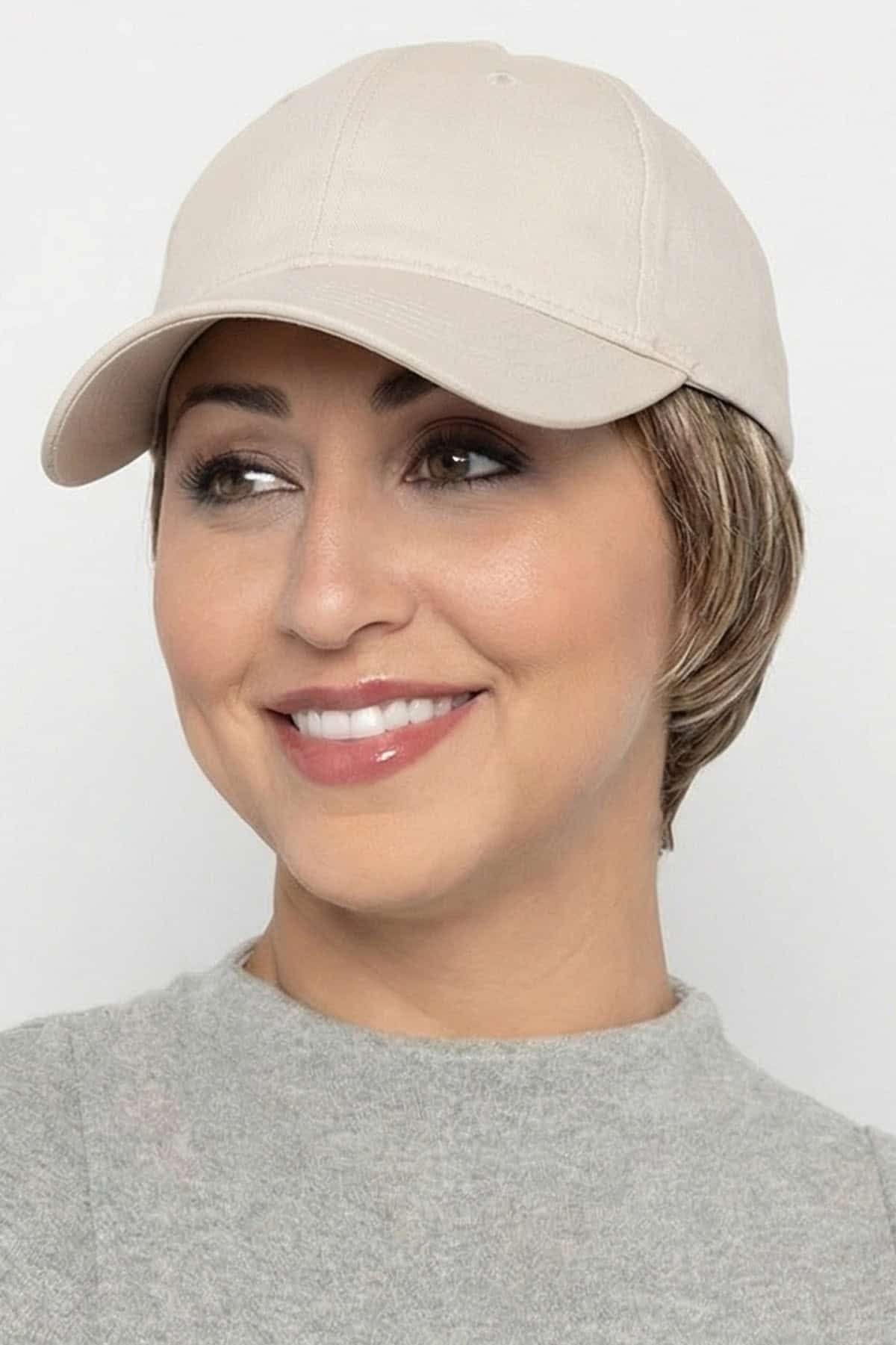 The Beige Tapered Hat by Henry Margu pairs a structured baseball cap with a short, close-cut pixie that tapers neatly at the nape. The length sits just at the neckline with layering through the sides that keeps the shape clean and controlled. The cap design offers quick coverage without the feel of a full wig. Soft fibers keep the look believable, while the adjustable back strap helps it stay secure through daily movement. A practical option if styling feels like too much.