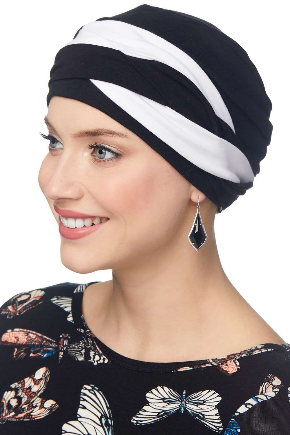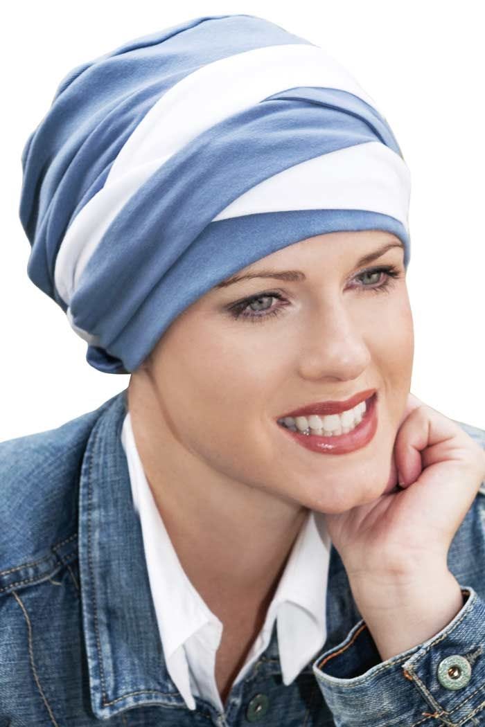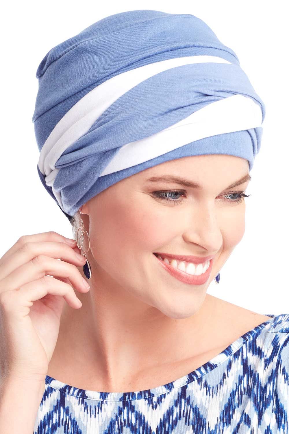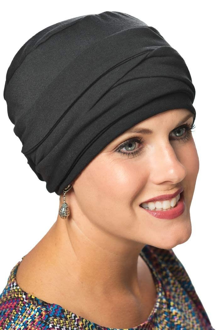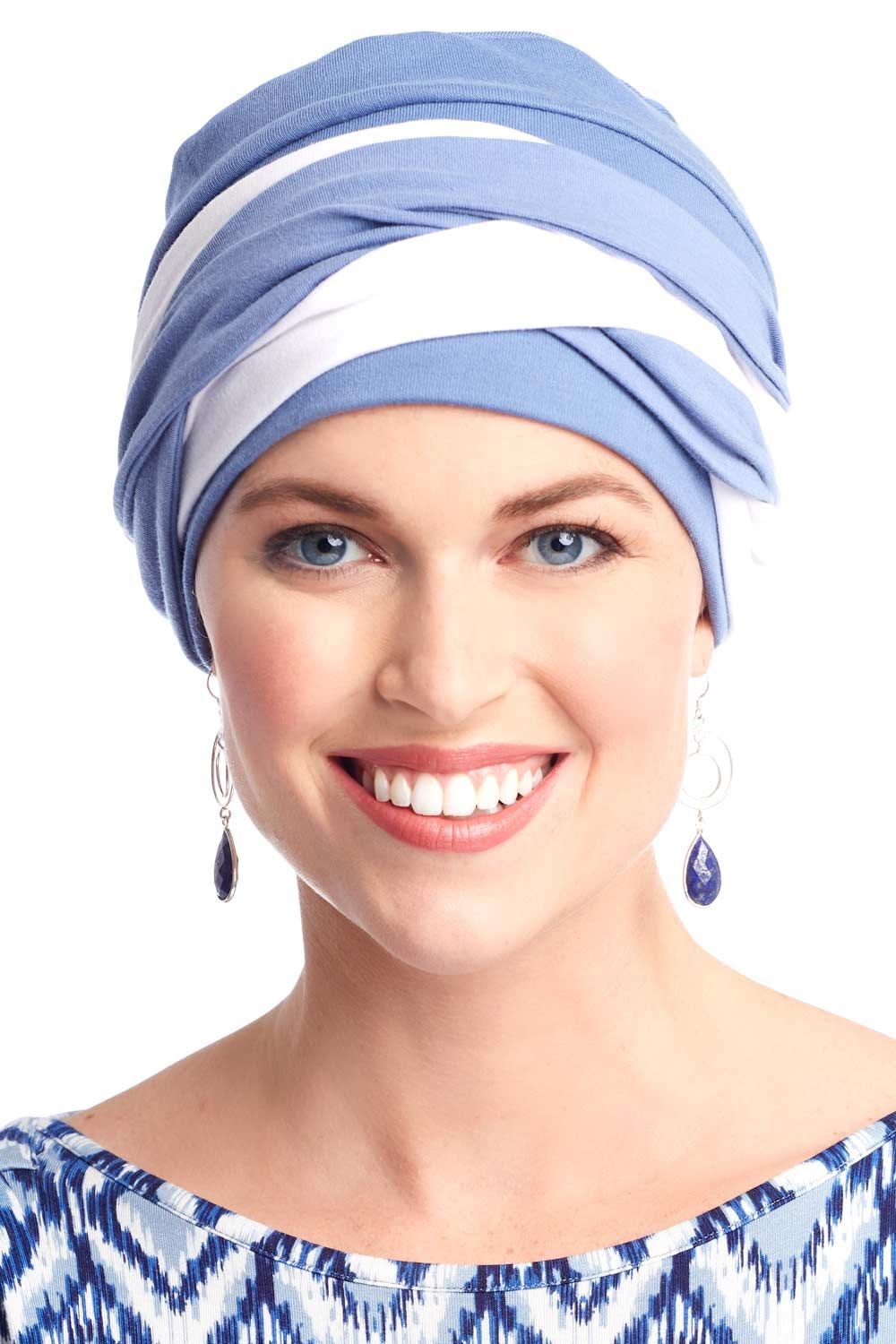 This extra soft turban features our classic three seam turban topped by an intricately braided band. Although this one looks complicated, this fashionable style is so easy to use! Simply wrap the band around the head and velcro it in place! We love this classic criss cross design affixed to a cozy and comfy turban. Just like our original three seam turban, this one's soft feel makes it great for sensitive scalps. It doesn't itch or have harsh seams that can irritate the head. A full top gives a very flattering appearance that is so often desired by those with hair loss due to cancer, chemotherapy, alopecia and other types of medical hair loss conditions. The braided Becky turban feels soft on even the most sensitive of scalps!