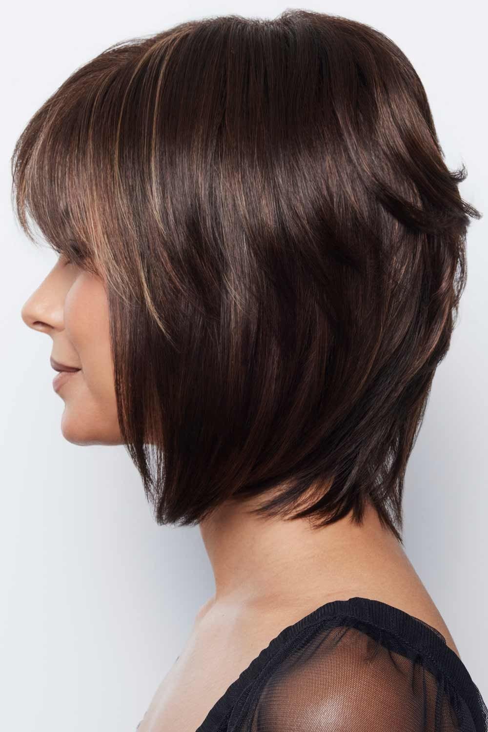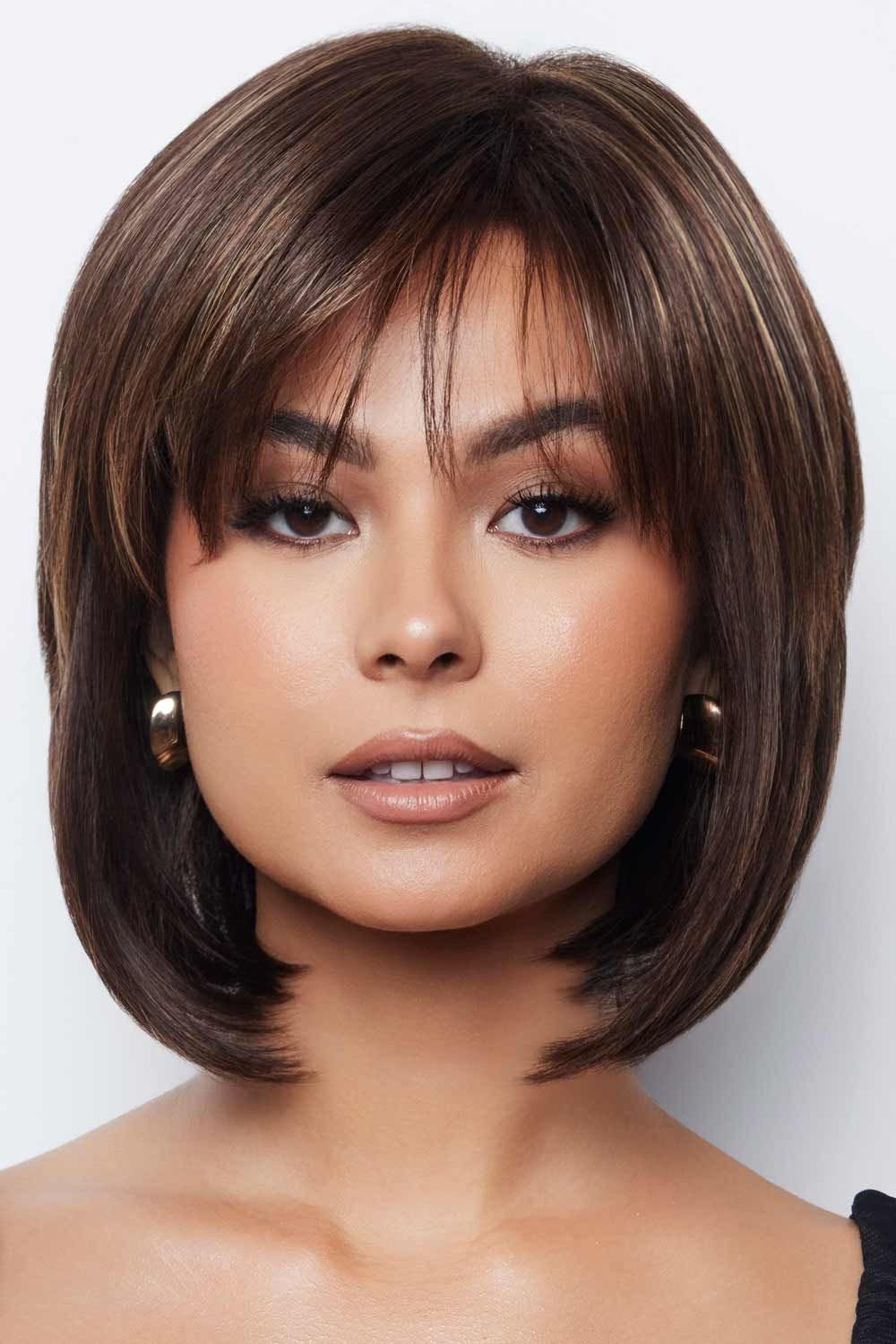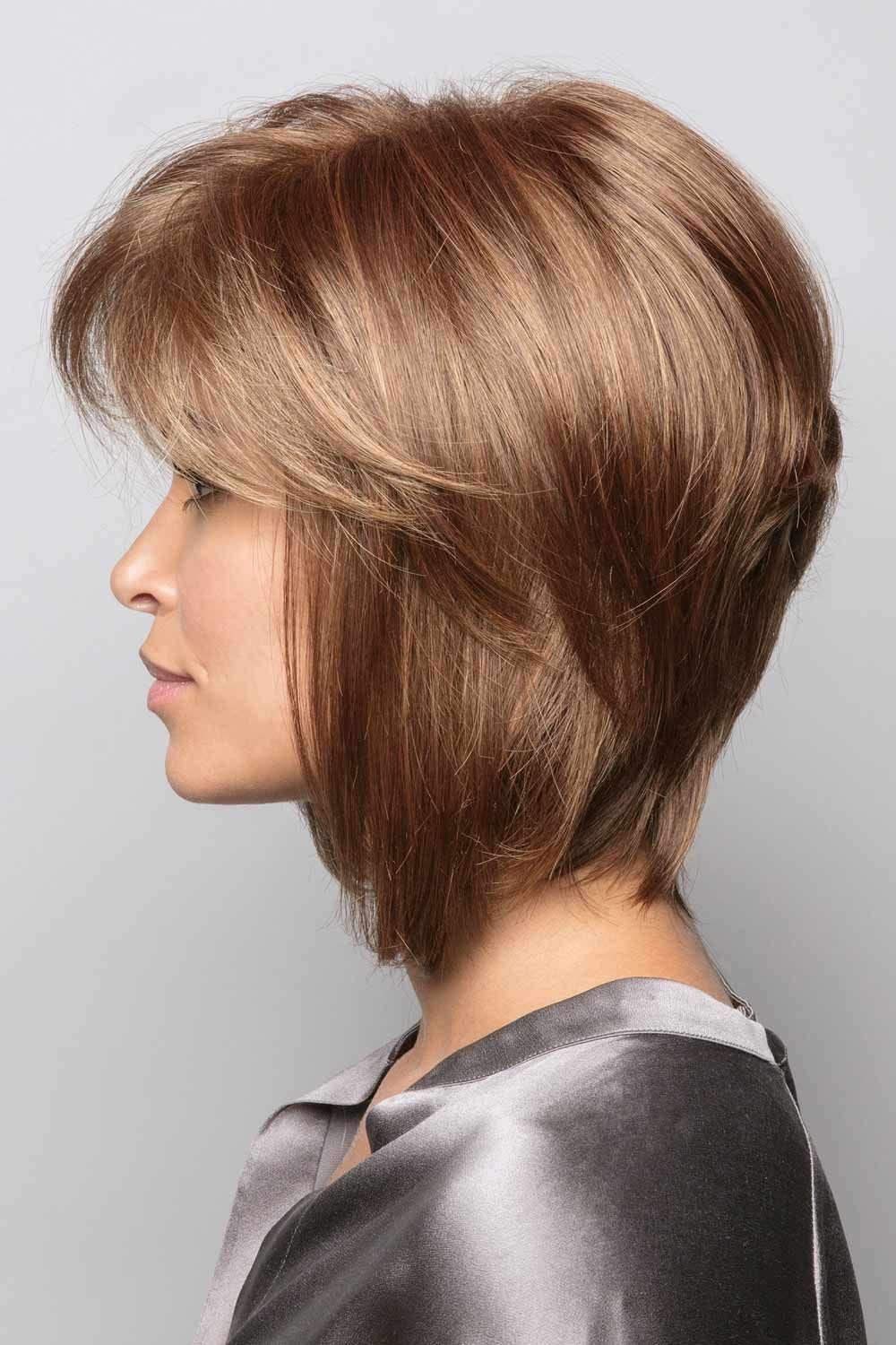 This short, sweet style is barely waved for maximum appeal. The soft waves fall in loose layers at the crown of the head, while the full length curls just under the jawline. Wispy bangs complete this feminine style. Cameron by Rene of Paris Wigs is best suited for those wearers with an average head size.