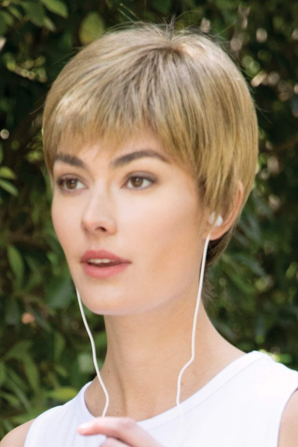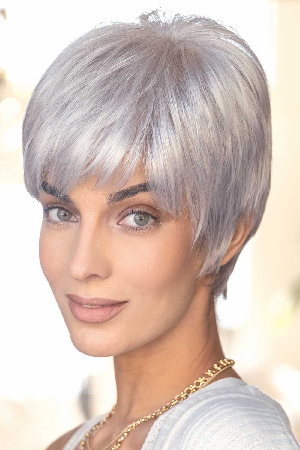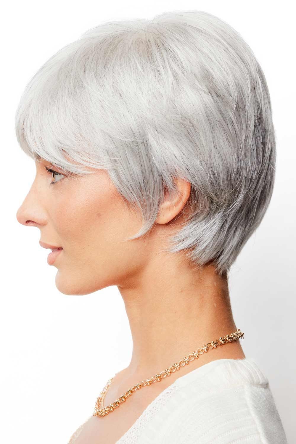 This easy to wear short, page boy style boasts sleek layers that are sure to please. Full front bangs and a tapered nape in back give this look a great style element. A monofilament top allows for ease of styling and gives the appearance of natural hair growth and movement.
