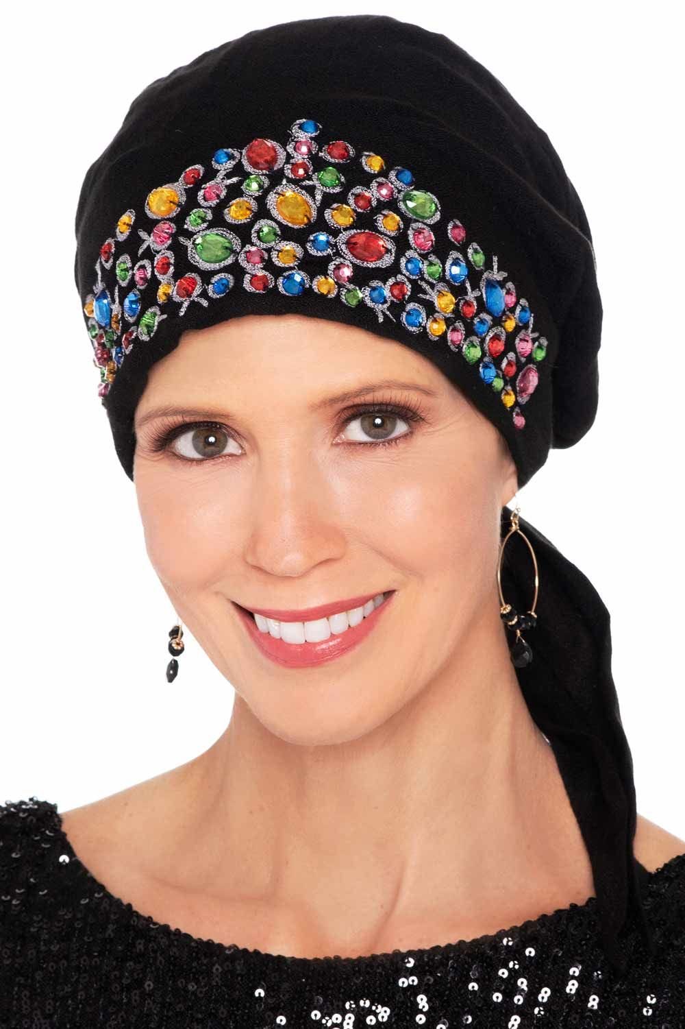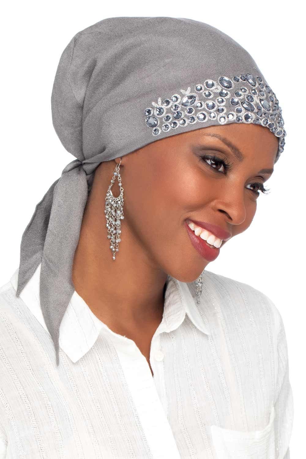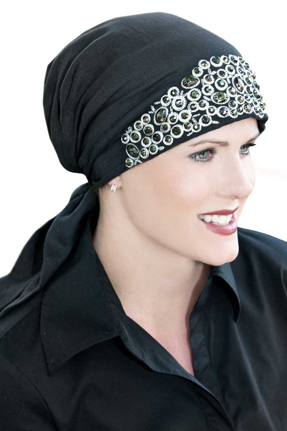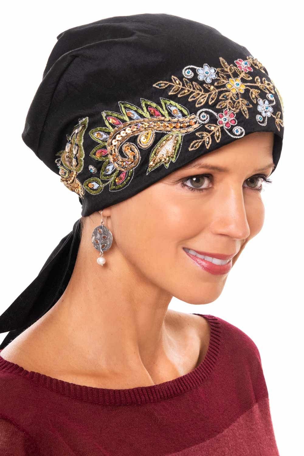 Our designers have paid attention to every detail on this exquisite headcovering. This pre-tied scarf is not only easy to wear, it features beautiful embroidery with hand sewn beading and sequins. Be prepared for compliments! We love this easily achievable scarf look that is such a popular look right now. This flattering, easy to wear style is ideal for casual wear. You don't want to miss out on this fashion forward style! When tied, this scarf provides total head coverage for women with hair loss due to cancer, chemotherapy, alopecia, or other types of medical hair loss conditions.