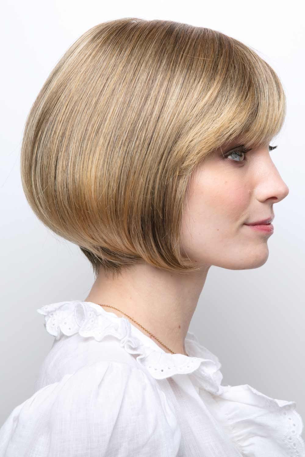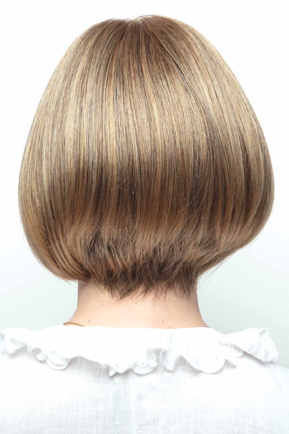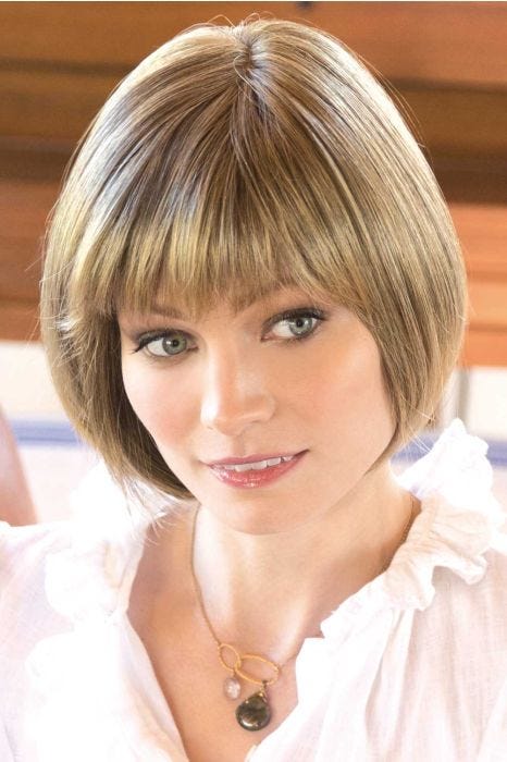 Erin by Amore Wigs is a transformational bob with beveled fullness throughout the nape and sides. Full fringe in the front allows for a feminine feel. A monofilament top allows for multidirectional parting possibilities and gives the appearance of natural hair growth.