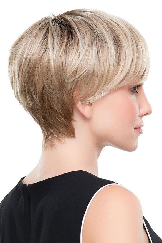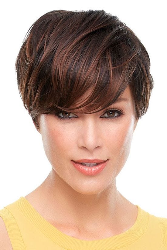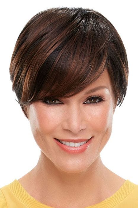 This stylish cut offers plenty of sassy sophistication. The long bangs in front are side swept offering a flirty retro feel while being manageable and sophisticated. The back is stacked for a modern look that is sure to please. The strands brush the top of the eyebrows in front, graze the ears on the sides and brush the nape of the neck in back. Soft layering on the top and sides creates naturalistic movement and swing in front. It's a short, sweet cut with an edgy appeal. Whether worn touseled or smoothed down, the look of this wig is undeniably stylish. The lace front of this wig allows the hair to be styled off the face and gives a natural looking hair line. Suitable for the novice wig wearer with its ease of styling.