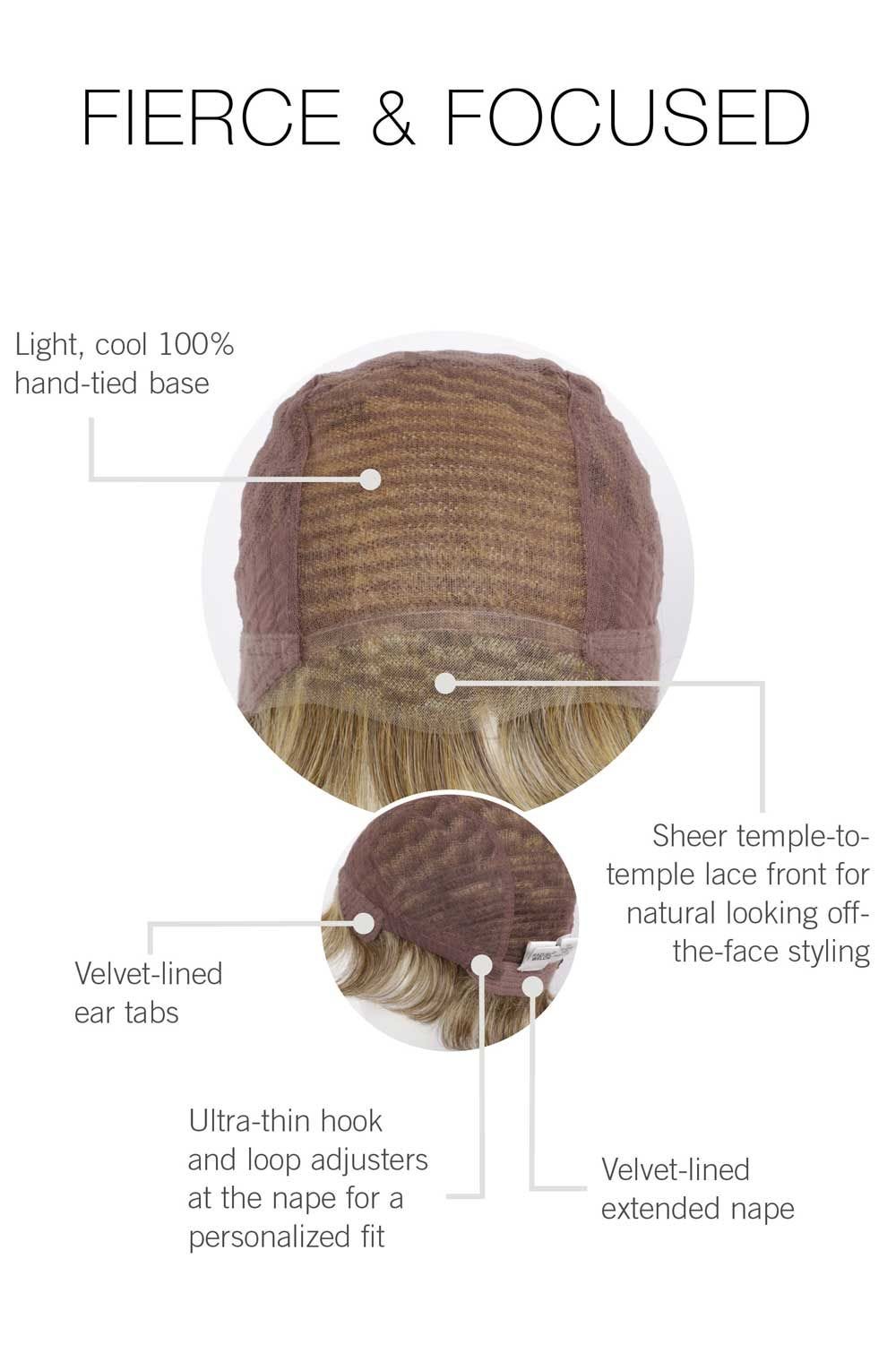 Fierce and Focused by Raquel Welch is a gently waved, short cropped style with a full crown, snug bangs, and tapered lengths. Style piece-y or smoothed down for a sleek, elegant look. Features a temple-to-temple lace front for a realistic hairline. A hand-tied base lets you easily modify your hair part. Add more volume for a fuller look using heat tools on the Tru2Life Heat Friendly Fiber.