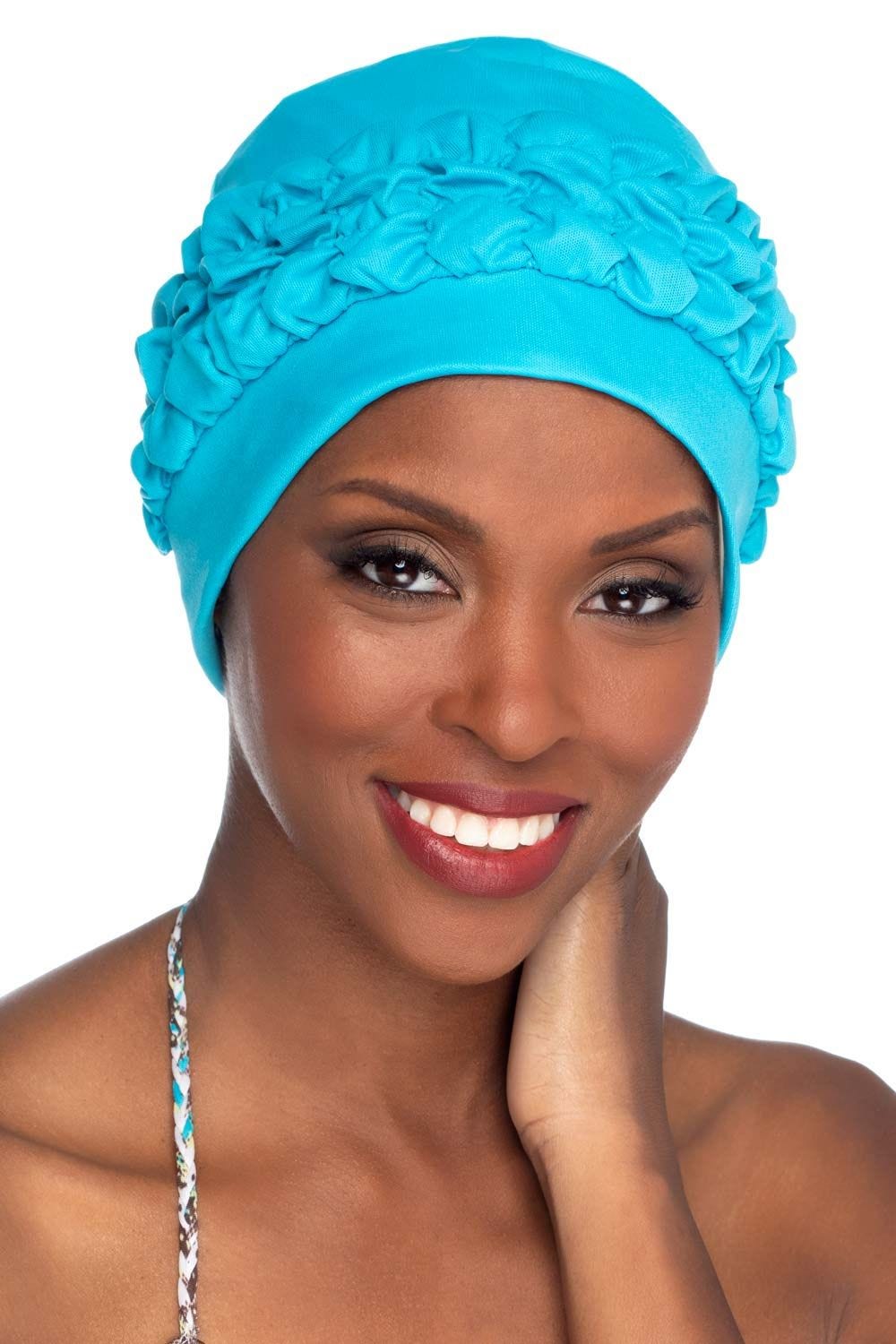 Our most vogue look to date is our retro polyester gathered swim turban. With three ruffled gathers in the middle, this turban creates an eye catching look that you'll be sure to love. It's got a superior fit and long lasting wear. We know you'll love this look!