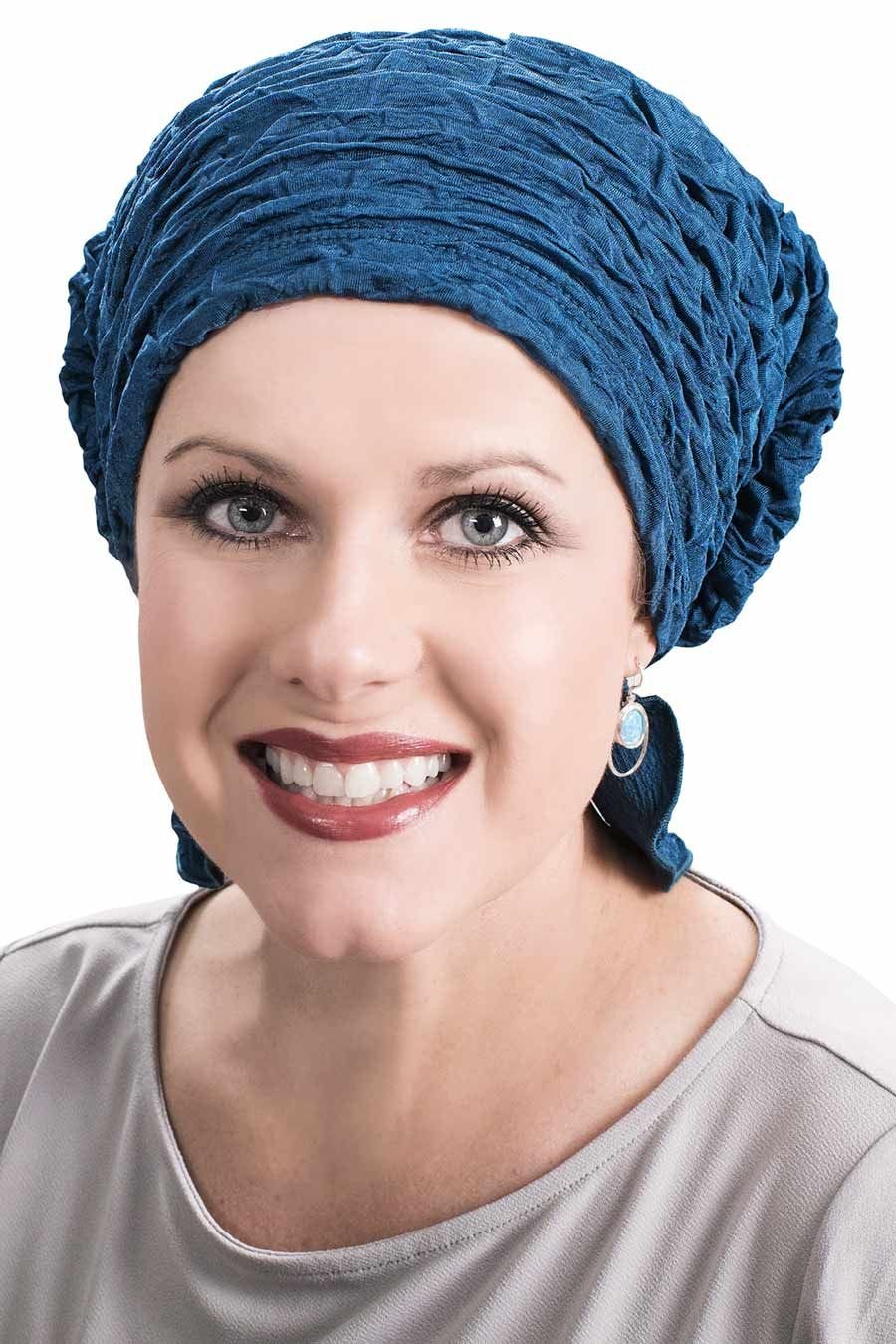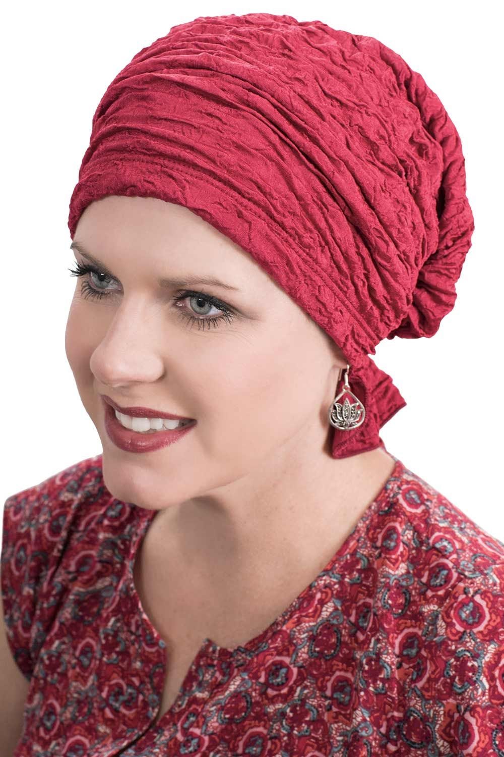 This fabulously textured fabric adds fullness to a bald head, so flattering for women with hair loss due to chemo, cancer treatments, alopecia and other medical hair loss conditions. The textured look and roomy back gives you volume and the look of hair underneath. Fashioned in an easy-to-use slip on design, this scarf beanie slips onto the head with ease and does not require any tying. The soft material is perfect for women with sensitive scalps. This gorgeous design is available in several beautiful colors to give you plenty of options when pairing this look with your favorite outfits. It goes great with casual wear for wearing to treatments or running errands, but can be dressed up with accessories to pair with work attire or dressier looks.