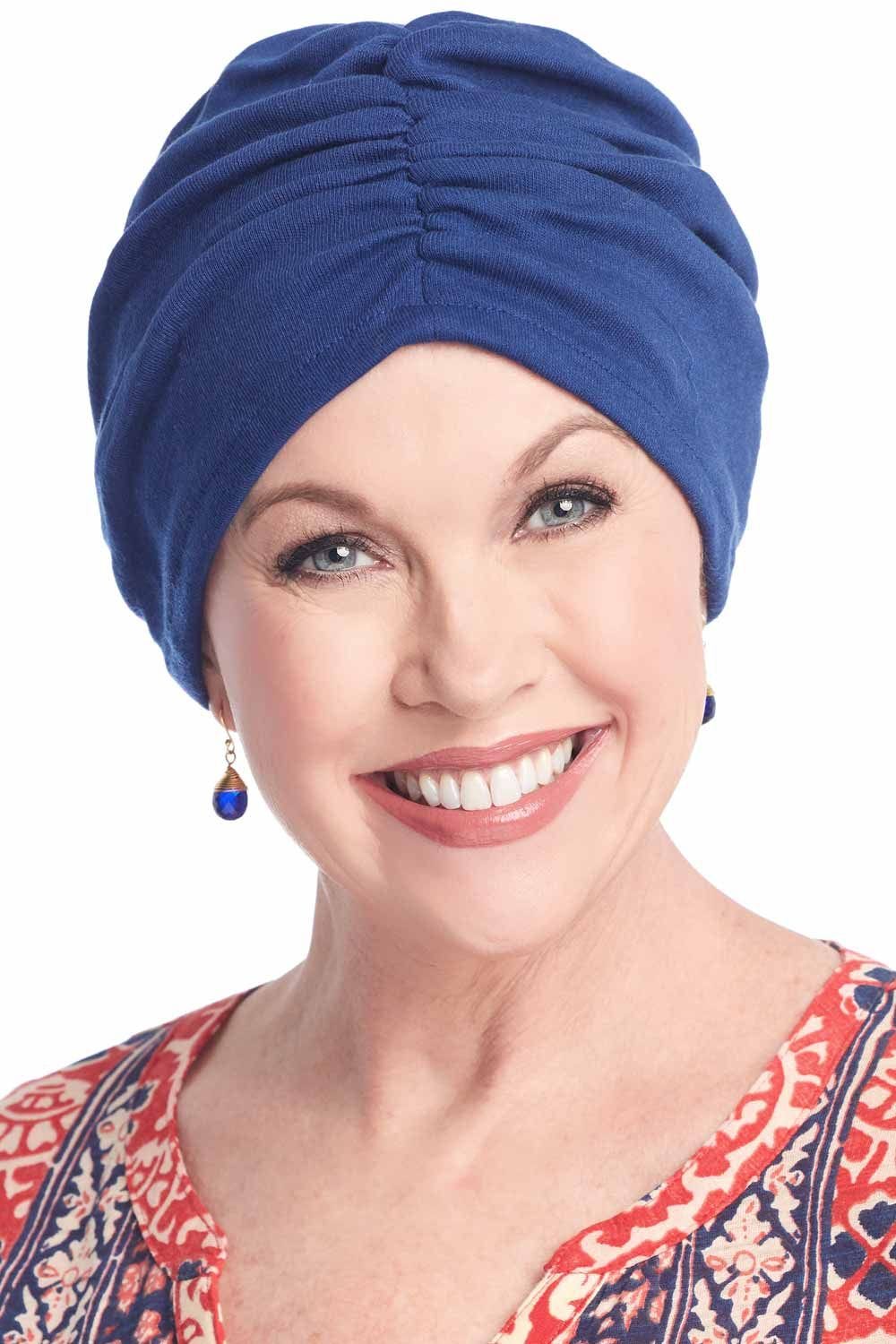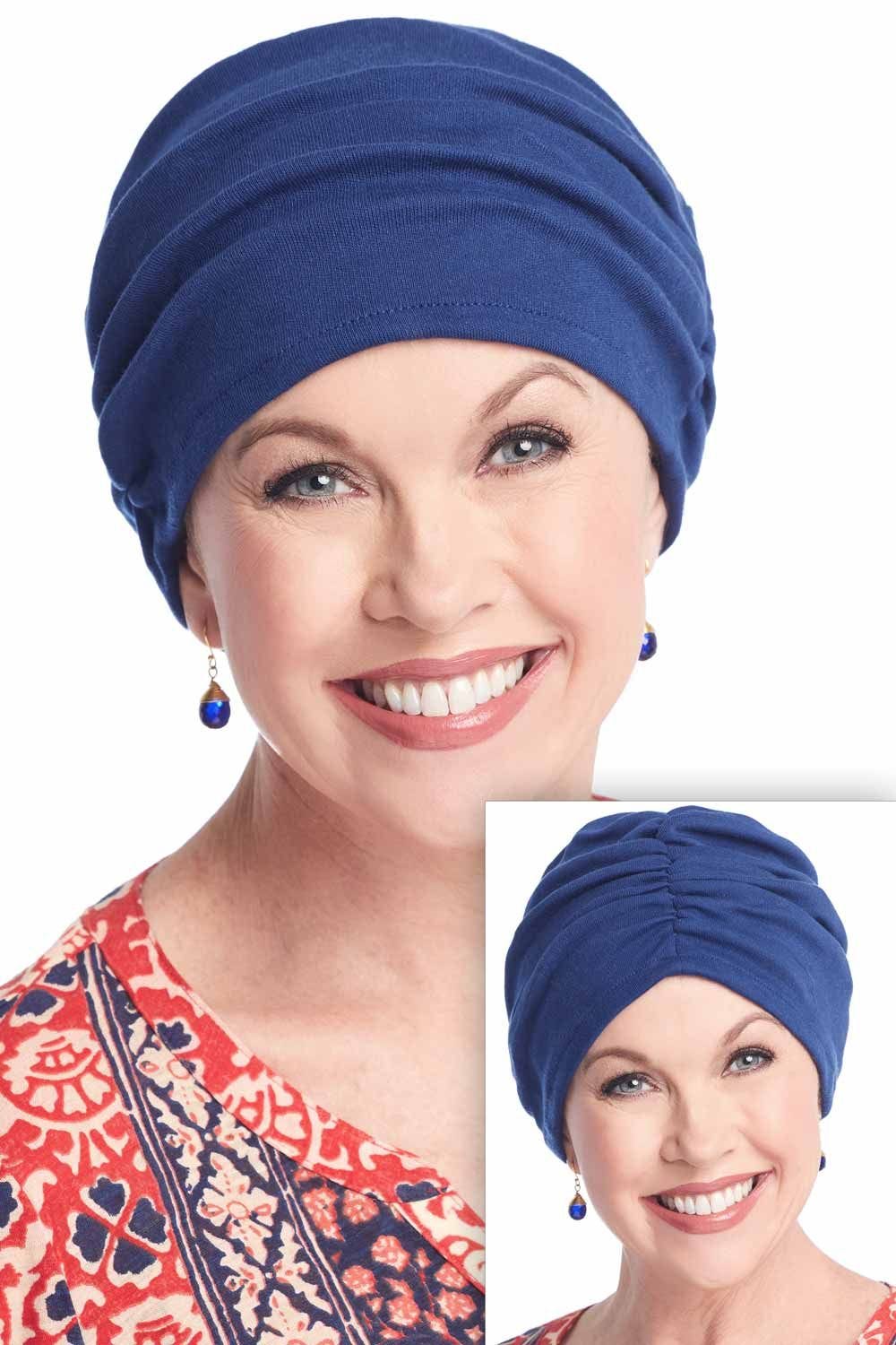 This comfy, easy to wear design comes in a variety of colors- perfect for any occasion! Wear the gathers on the side, in the front or just off center for 3 unique looks. Designed by our founder, Carol Galland, especially for cancer patients and women with hair loss. This one is also a fashionable choice for women without hair loss, just looking to spice up their headwear wardrobe. Dress this one up or down with headwear accessories for even more styling options. Pair it with statement earrings and a nice blouse for a dressier look, or wear it with casual clothes for a laid back look. It's an instantly classic look that will have you wanting to wear it with everything in your wardrobe. Order one today in one of the many colors that we offer.