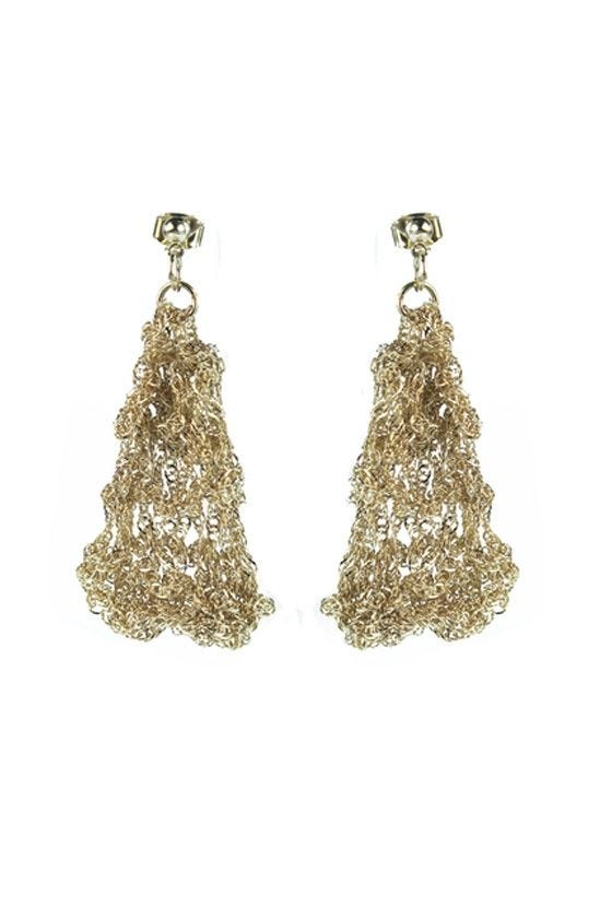 Hand-crocheted in South Korea, each pair of these earrings is truly one of a kind. Delicate gold-plated chain is crocheted into a shimmery mesh that has beautiful movement and shine for a dramatic effect. These light-catching earrings make a big statement, so they're perfect for parties and formal events, as well as adding some sparkly flair to your everyday look. Unique and glamorous, these earrings are definite must-haves.