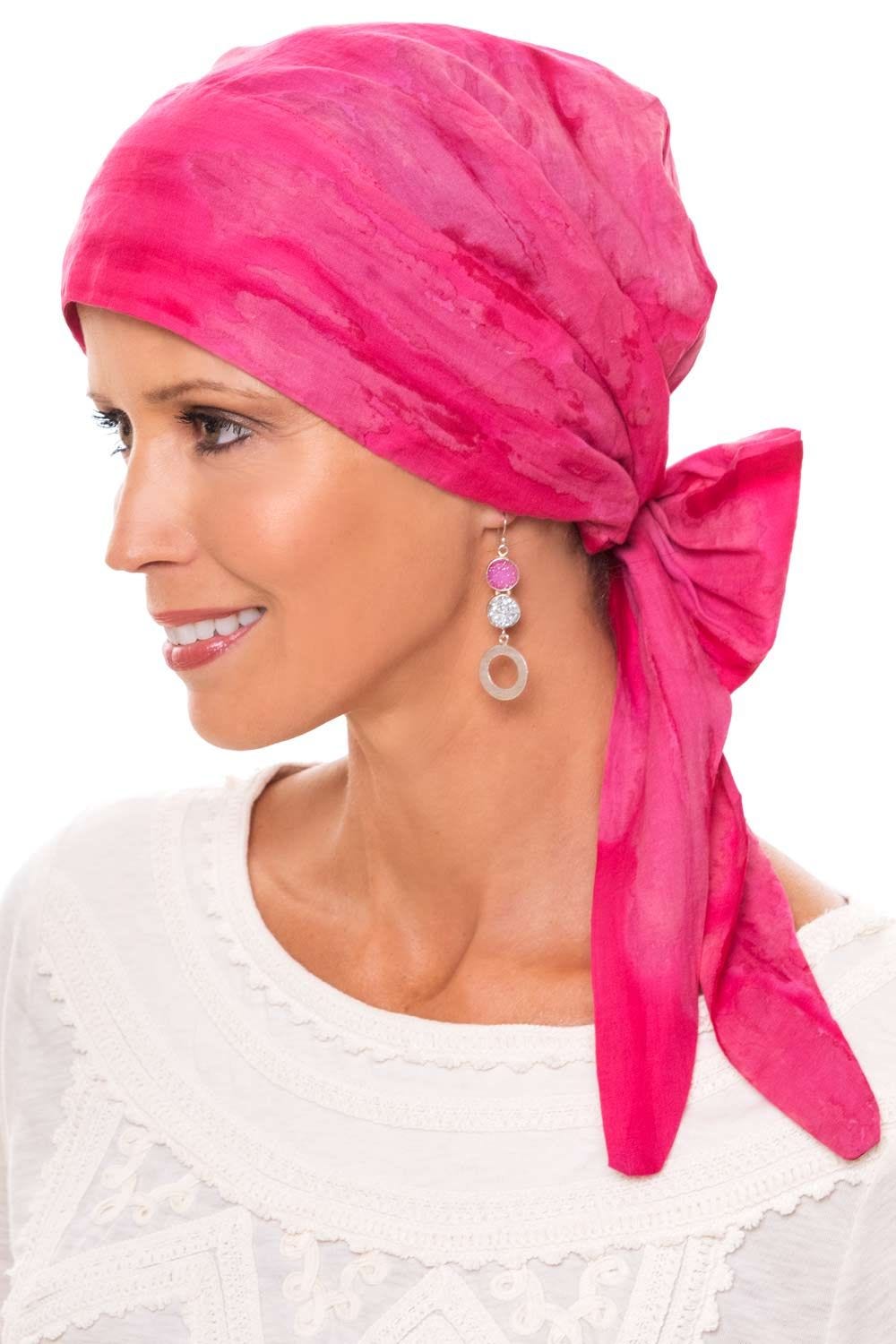 Our Hannah headwrap is now available in 100% cotton tie dye. This easy to wear headwrap can be tied in many ways, to achieve different looks. Simply put the cap on the head and tie the two tails in a bow to achieve the look of a tied head scarf. Or wrap the tails around the head for the look of a turban or headwrap. The length of the tails allows for endless possibilities. This headwrap was designed by Danielle Yates, especially for women with hair loss due to cancer, chemotherapy, alopecia or other medical hair loss conditions. It provides full head coverage, a look that is so often desired by women with hair loss. The soft material of this wrap is perfect for sensitive scalps because it won't itch or scratch like so many others out there.