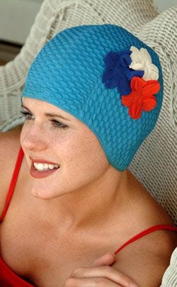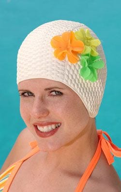 These old fashioned, retro swim caps are the perfect choice when a plain bathing cap just won't do! These retro feminine swim caps feature a triple cluster of flowers, for an old fashioned look like Esther Williams once wore.