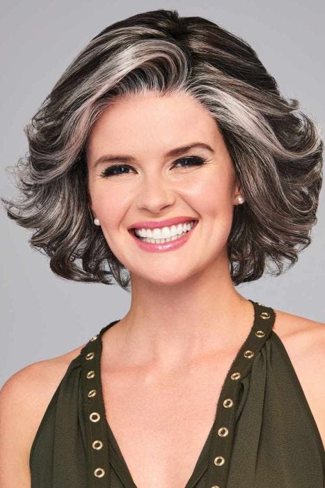 This stunning wig features subtle waves that fall in soft layers to create natural body and a flattering shape. It's chin length strands fall in face framing tendrils to create a sultry allure. Side swept bangs graze the eyebrow for a hint of sexiness. The sheer lace front of this particular wig allows the hair to be worn swept back from the face and creates a natural looking hair line. A monofilament part creates the illusion of real hair growth from the scalp and allows for styling versatility. This wig features velvet lined ear tabs and a velvet lined extended nape for comfort. Ultra thin adjusters at the nape create a personalized fit. We love the tousled look that makes High Impact by Eva Gabor a one of a kind wig!