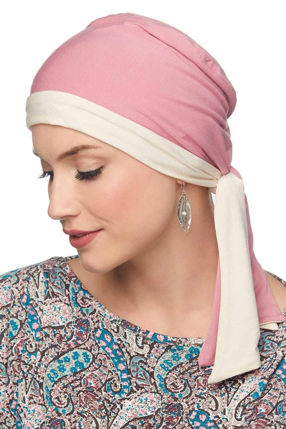 This soft as silk head covering is made in our ultra comfy viscose from bamboo knit fabric. This easy to tie head wrap features a basic cap that slips on the head, with two long tails. The tails can be tied in multiple ways for a wide variety of looks. Tie the two tails in a knot in the back or on the side for a basic wrap. Tie a bow for a pretty head wrap or tied scarf look. Twist the ties on the side and tuck the tails in for a retro rosette look. Turn the headwrap inside out and you have a whole new head covering for two wraps in one! Create dozens of looks with just one easy to use head wrap. This beautiful head wrap features total head coverage when tied, perfect for women with hair loss due to cancer, chemotherapy, alopecia, or other types of medical hair loss conditions.
