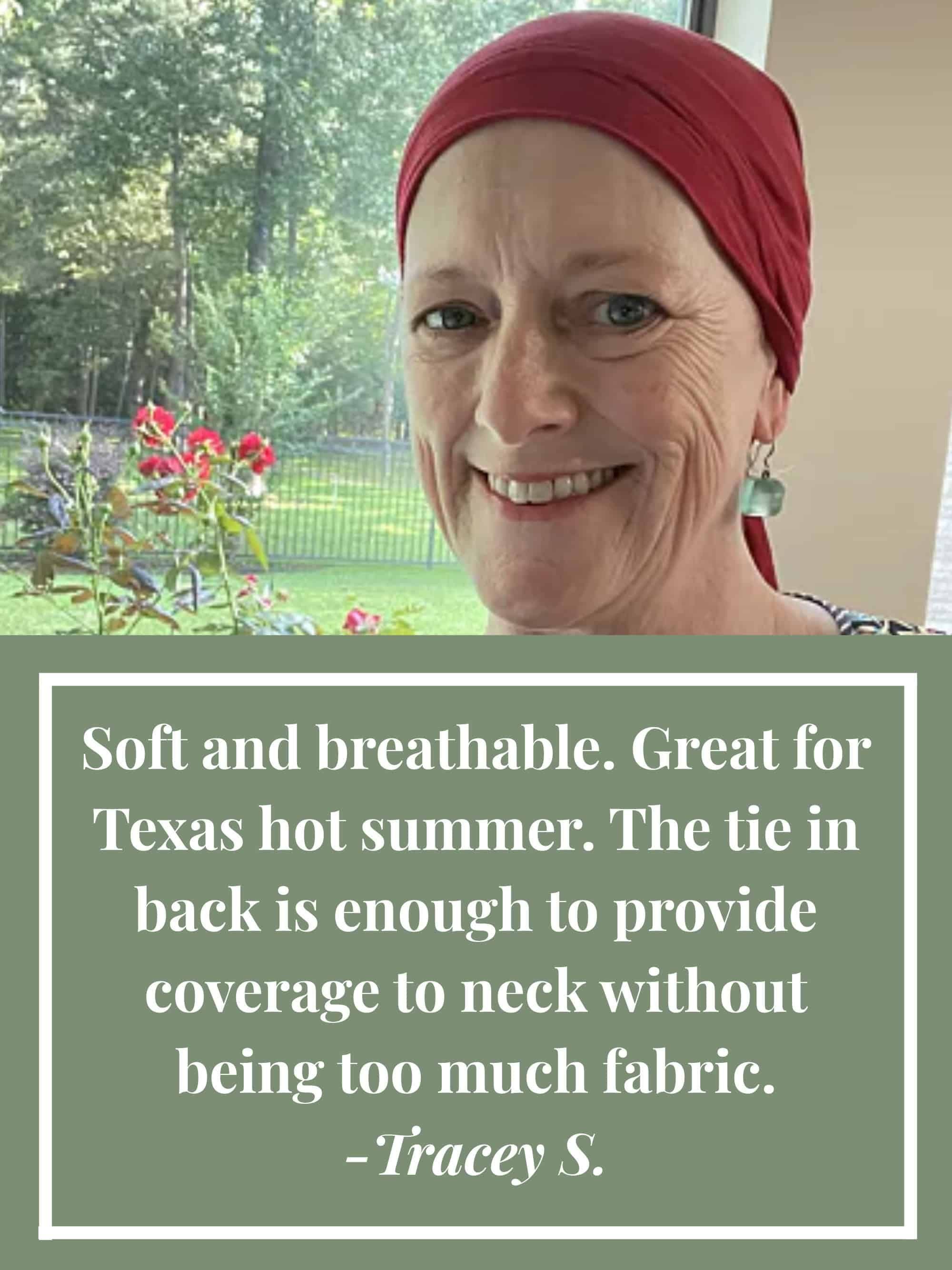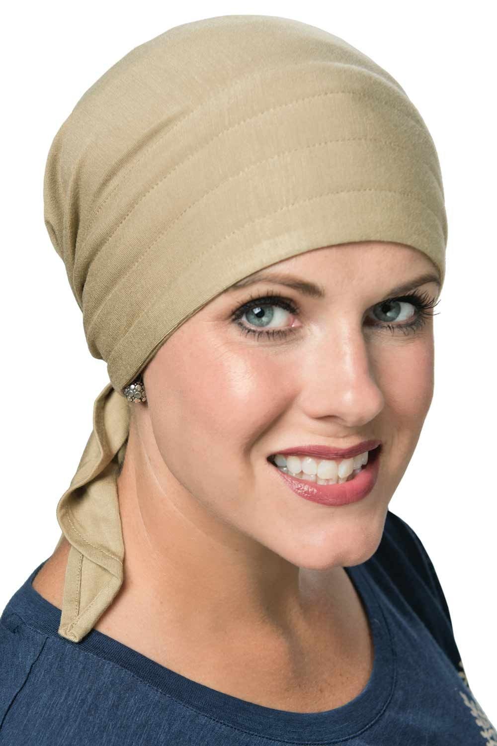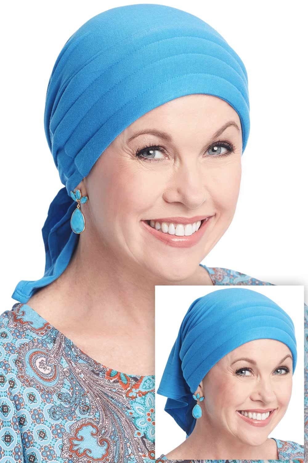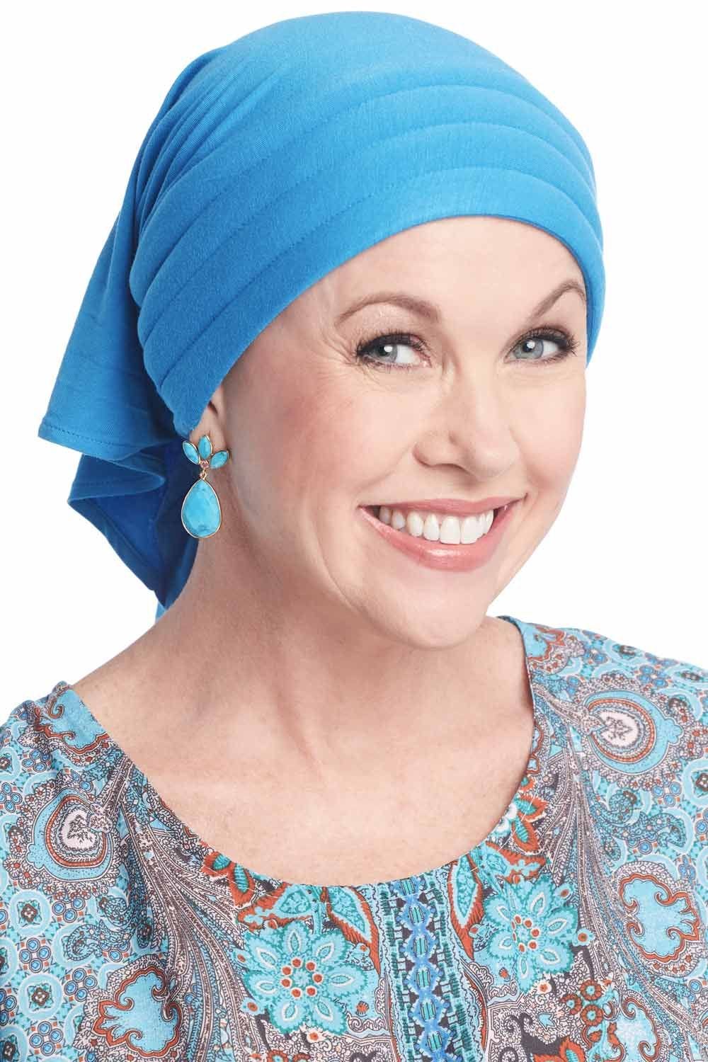 This easy to tie scarf is fashioned in a luxurious viscose from bamboo material that is ultra soft to the touch and feels oh so comfortable on the head. It is lightly padded in front to add a flattering fullness that is so often desired by women with hair loss due to cancer, chemotherapy, alopecia, or other types of medical hair loss conditions. The easy to tie shape and form make it ideal for women undergoing treatment who may not feel up to intricately tying a flat scarf. To wear, simply place the padded area of the triangular scarf on the forehead near the hair line, cross the ties in the back, and tie into a simple knot or bow. This easy to wear style goes great with just about anything in your wardrobe! It is versatile enough to be worn with casual wear or dressed up with accessories for special occasions. We just know you're going to love the look of our Instant Tie Pre-Tied Head Scarf in Luxury Viscose from Bamboo by Cardani!