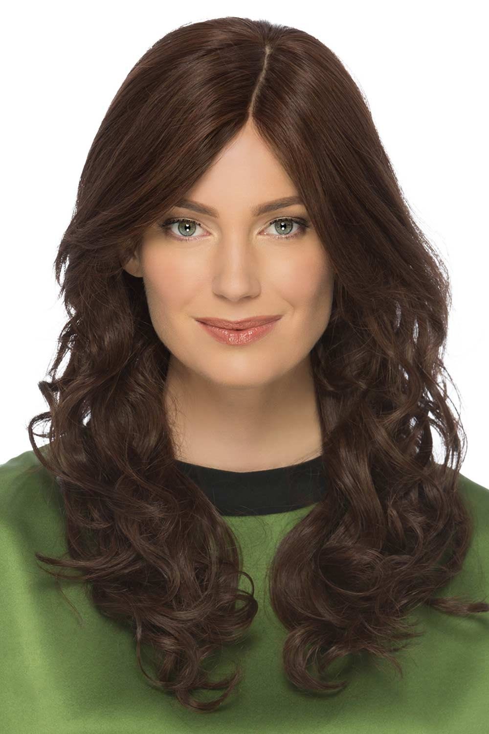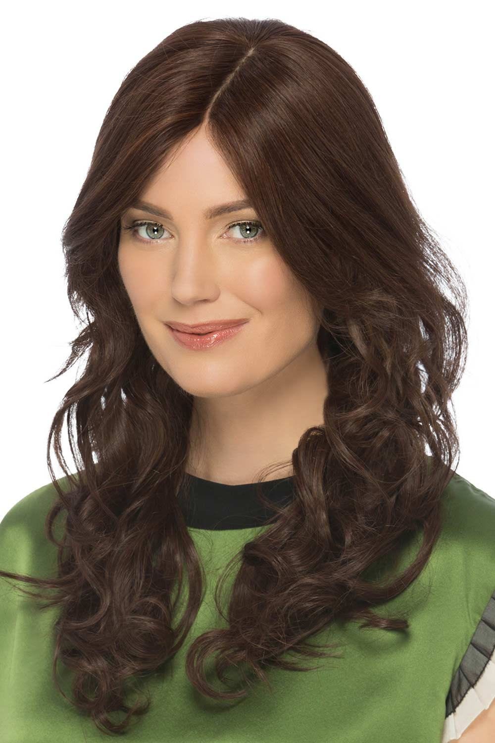 Isabel by Estetica Designs is a long, silky design made from high quality human hair. The glamorous spiral curls add a full yet delicate appearance. This wig also boasts a French part mono top allowing your to change your hair part any way you like.