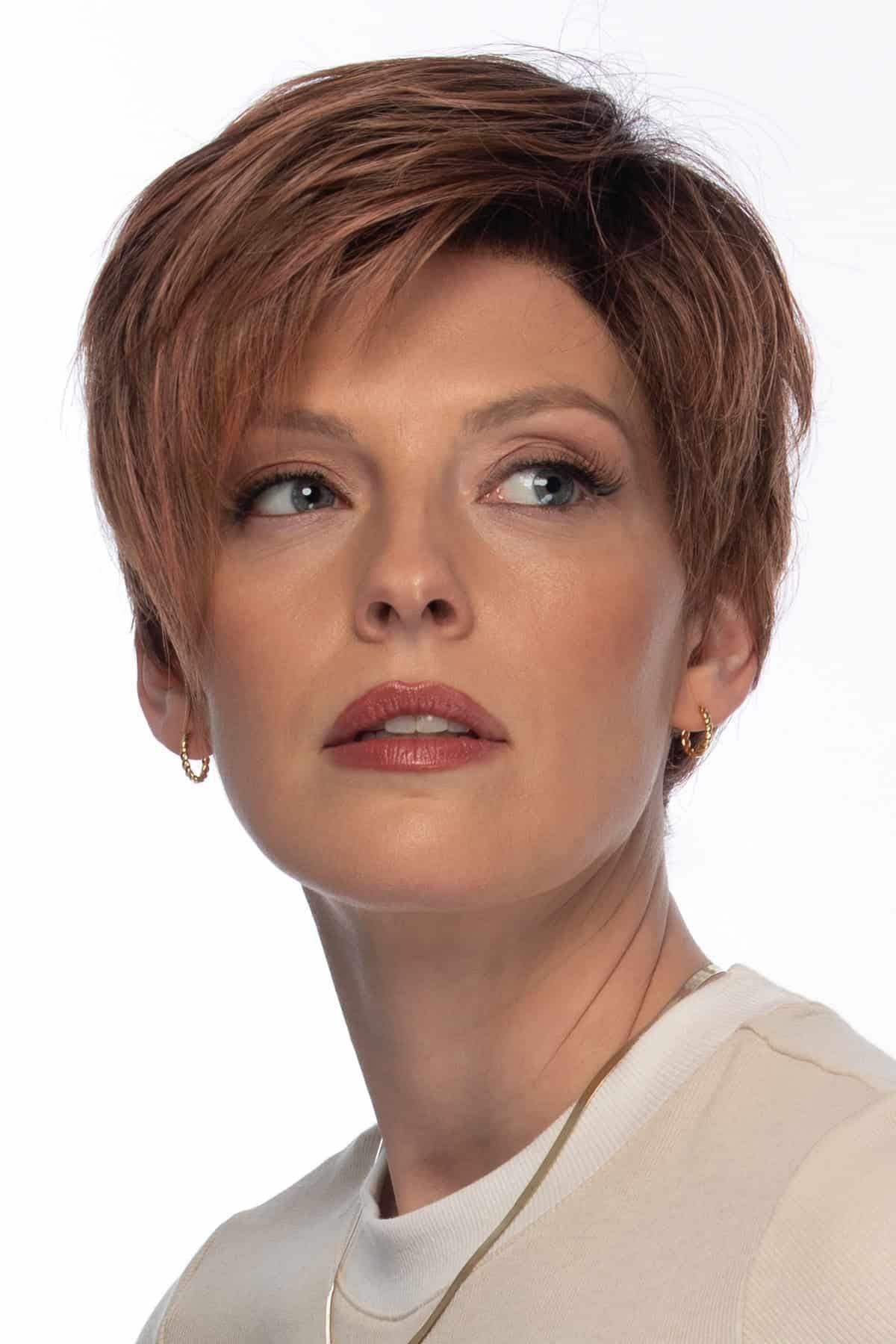 Jett by Estetica is a long, asymmetrical pixie. Hair can be worn edgy and messy or smooth and silky. Jett also boasts a lace front and allows the wearer to style hair off the face and still maintain a natural hairline.