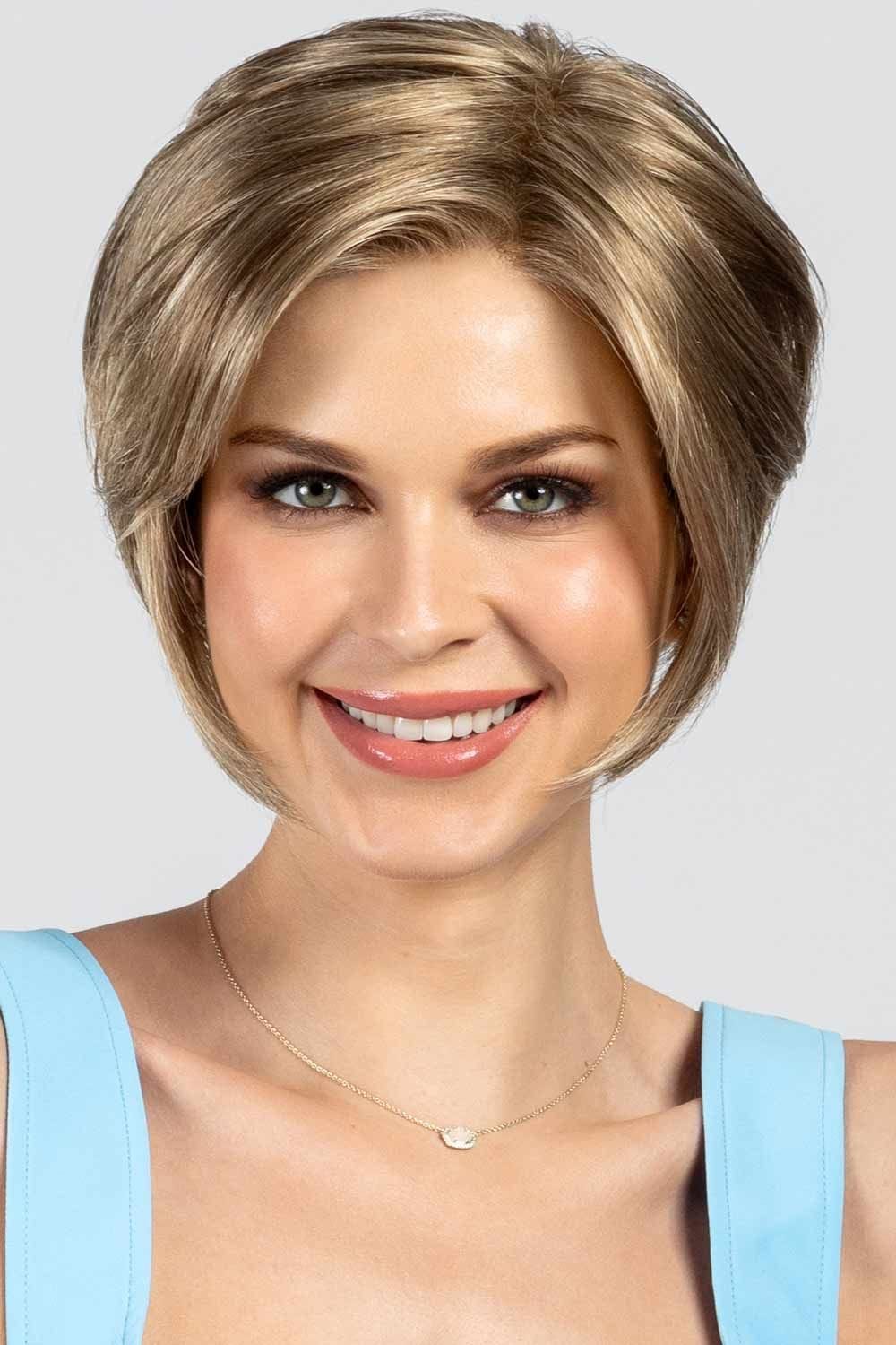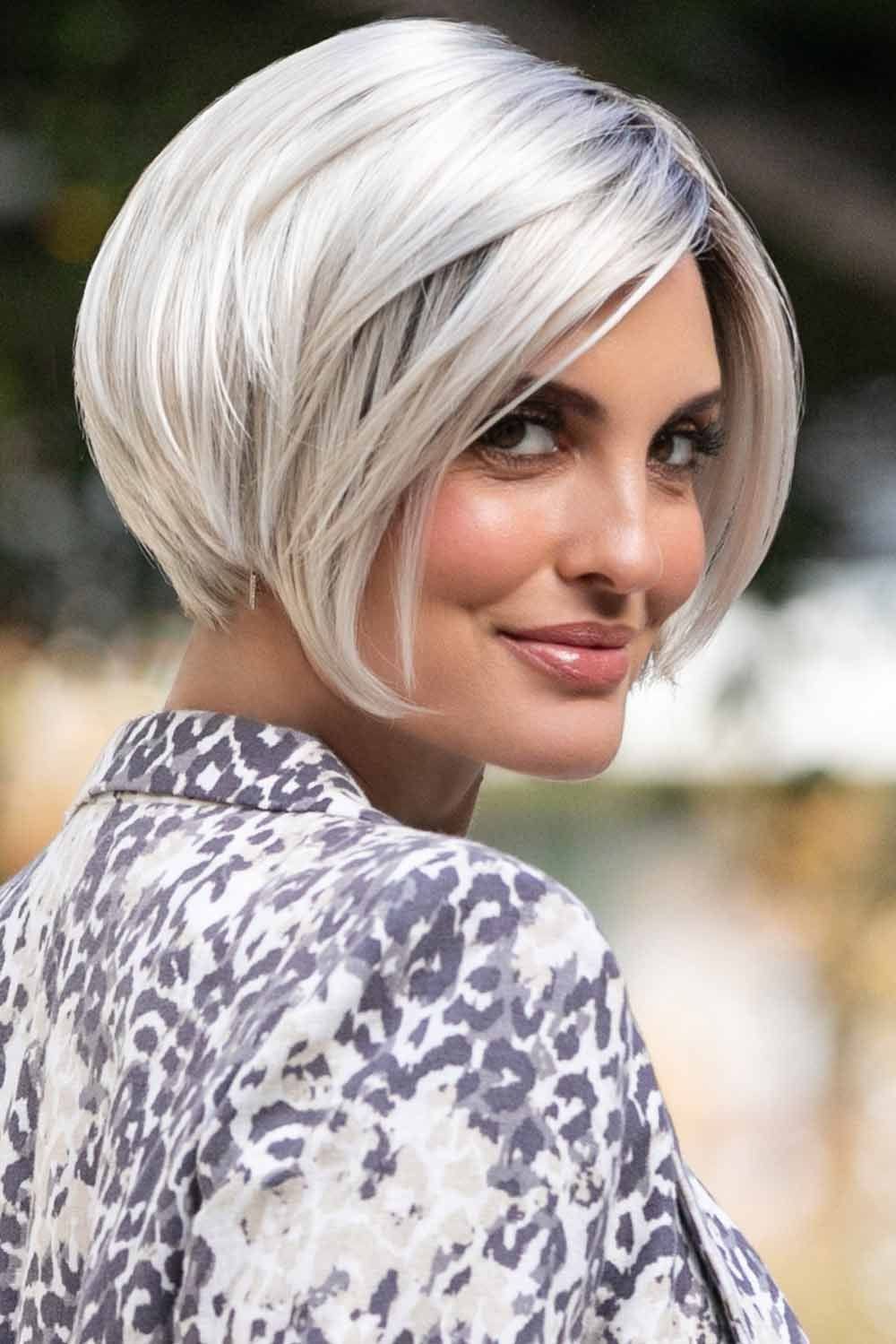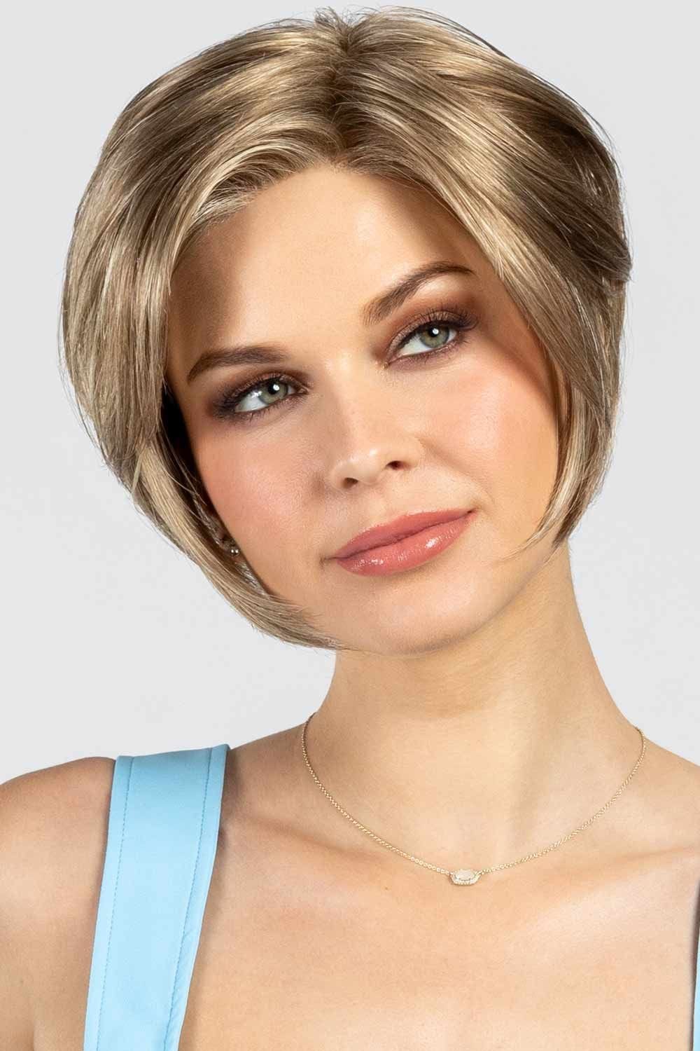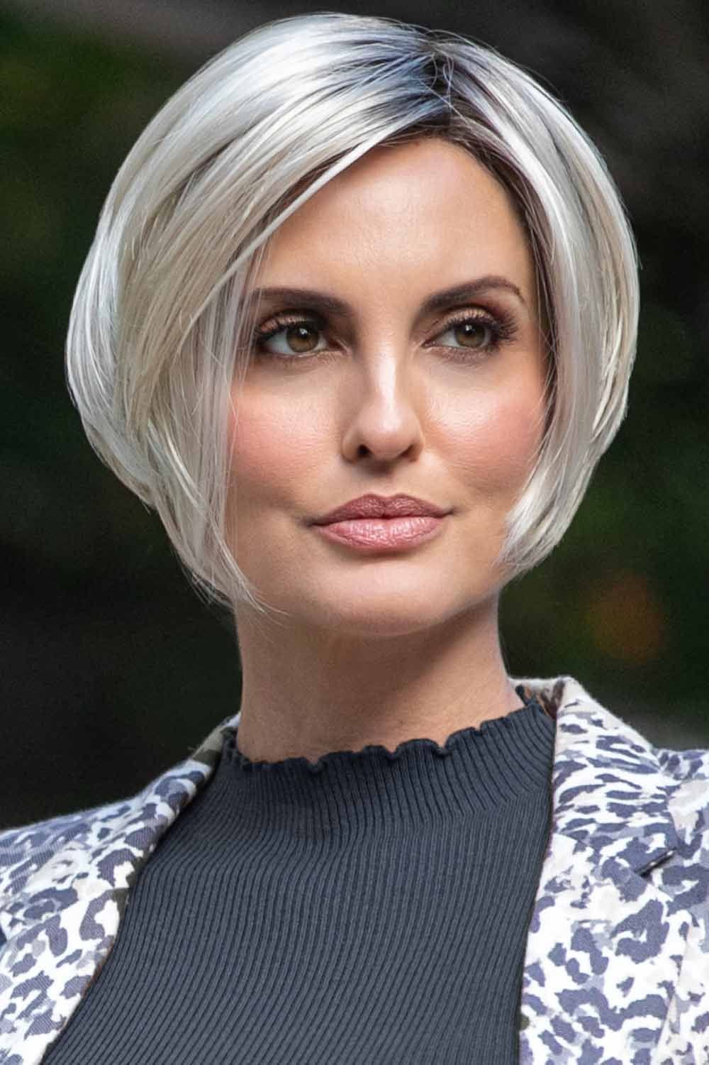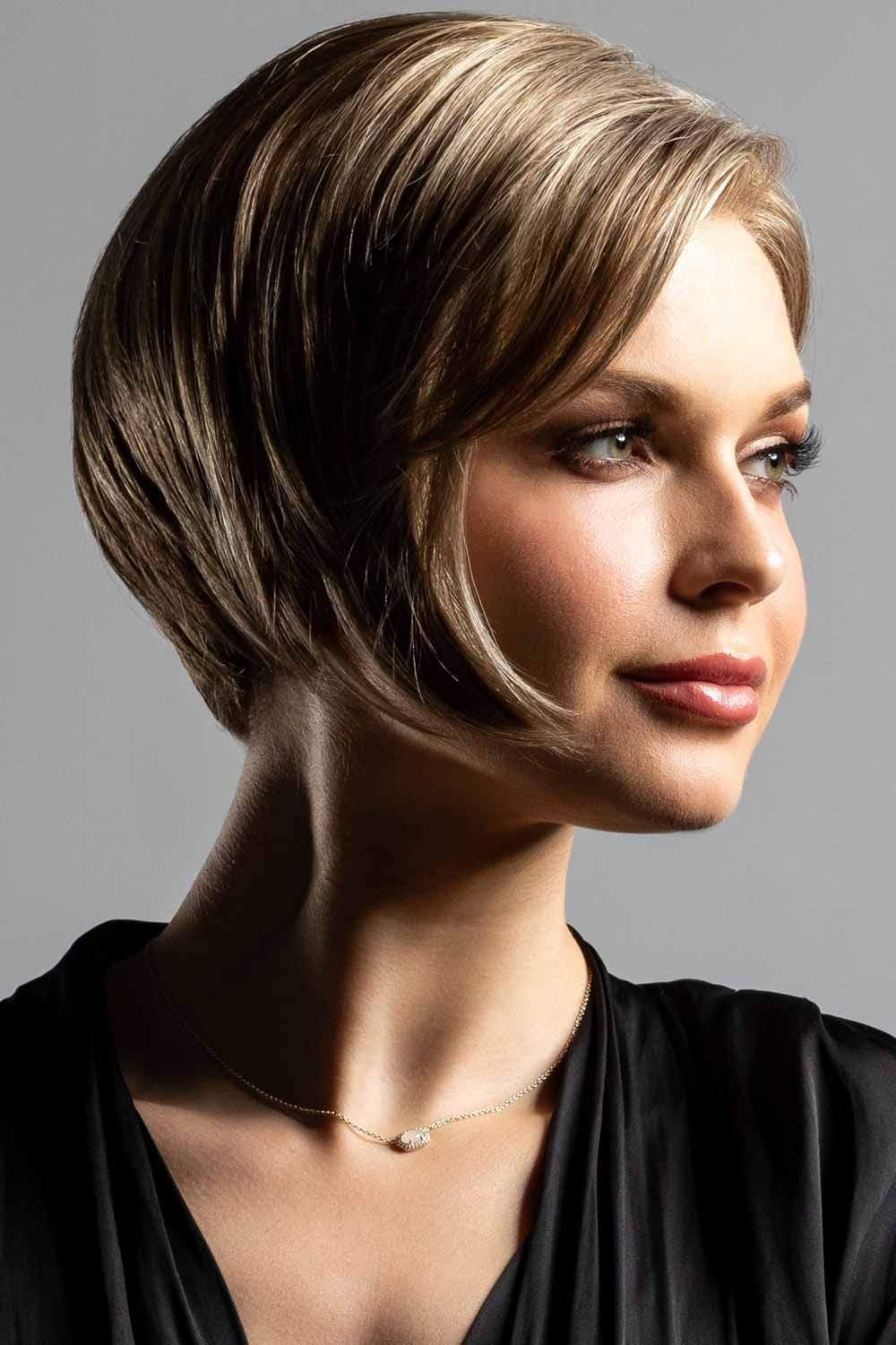 Imagine hair that feels like a whisper against your cheeks — Kari begins with a 7″ whisper-soft fringe that swoops elegantly to one side, brushing just above the brows. She shapes into a chic short bob with a gentle A-line slope: 7″ at the crown, tapering to a neat 6.5″ side and sleek 2.5″ nape. The result? A clean, eye-skimming silhouette that frames your face and shows off your neckline.