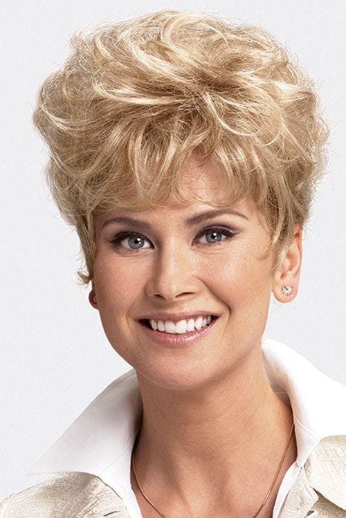 This loosely curled cut is a lovely look that provides a fullness to your already existing hair. This topper is perfect for women with thinning hair at the crown because it covers the top of the head. This is not a full wig, but a top piece that clips into existing hair.