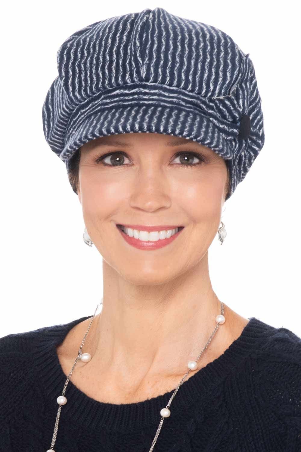 The Mavis Flower Newsboy Cap is a charming six panel newsboy hat with a side flower embellishment. A hard, formed brim provides protection from harmful sun rays. An elastic band in back gives the wearer a more personalized, comfortable fit.