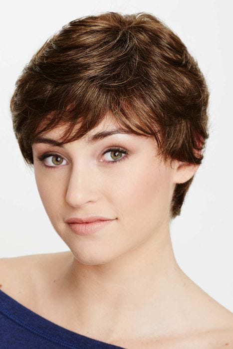 The Missouri Wig by Dream USA is an alluring pixie style with short bangs and a slight wavy style. Featuring a hand-tied, double monofilament cap.