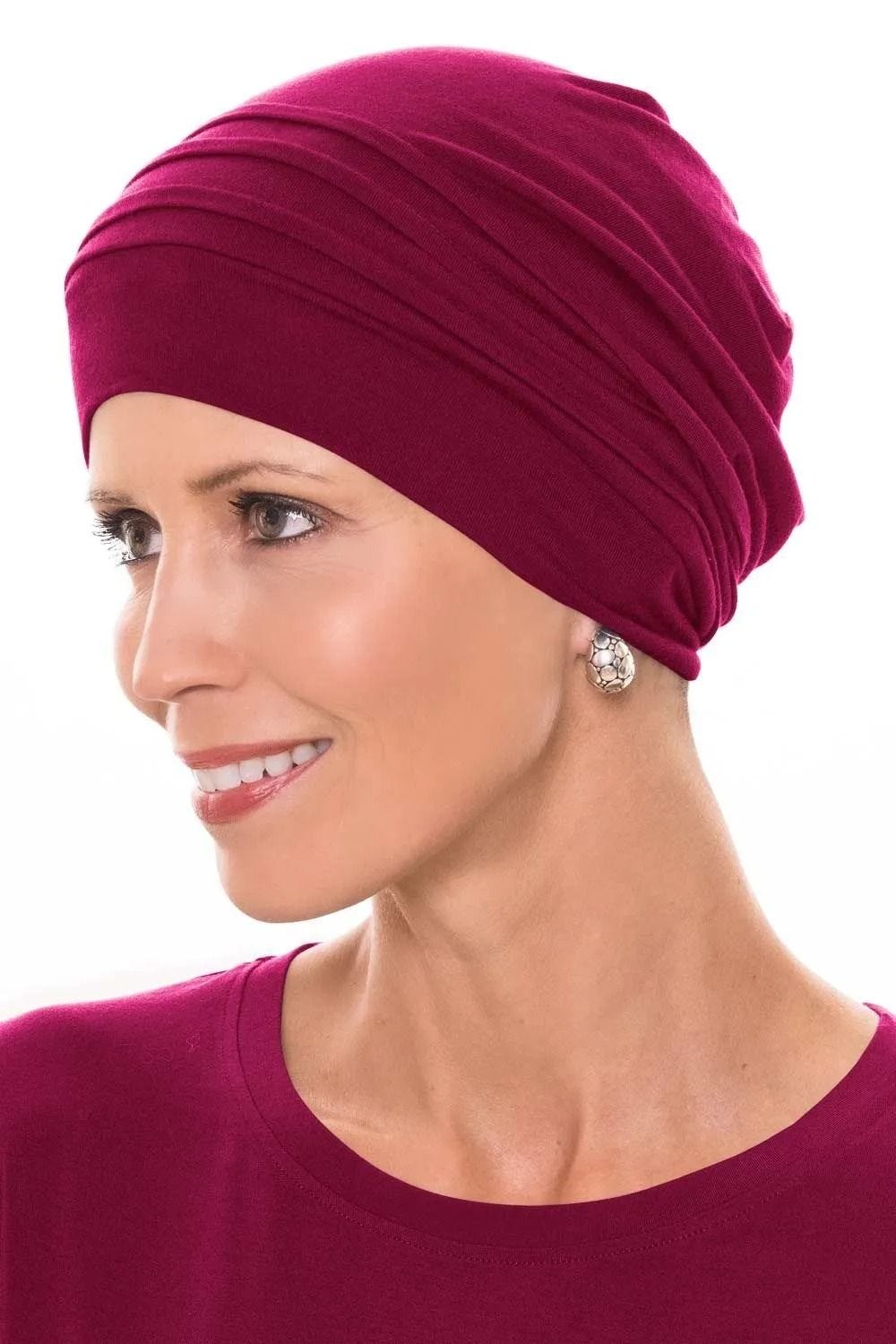 We just know you're going to love the luxurious look and feel of this fashionable cap. This patented style is Headcovers exclusive, the Cardani® Mod Slouchy Snood Cap features slouchy fabric in the back to give the illusion of hair underneath. This is a look that is so often desired by women with hair loss due to cancer, chemotherapy, alopecia, or other types of medical hair loss conditions. This tagless, nearly seamless design will soothe even the most sensitive scalps. As always, this hat offers total head coverage, perfect for our customers with hair loss. It's also a great look for women with hair because it has plenty of room to tuck hair inside, and can also be worn with hair down because it is just so fashionable. Pair this one with casual wear for a more laid back look, or add flashy accessories to give it a dressier feel. It's available in several beautiful shades, so you're sure to find one that will match just about everything in your wardrobe.