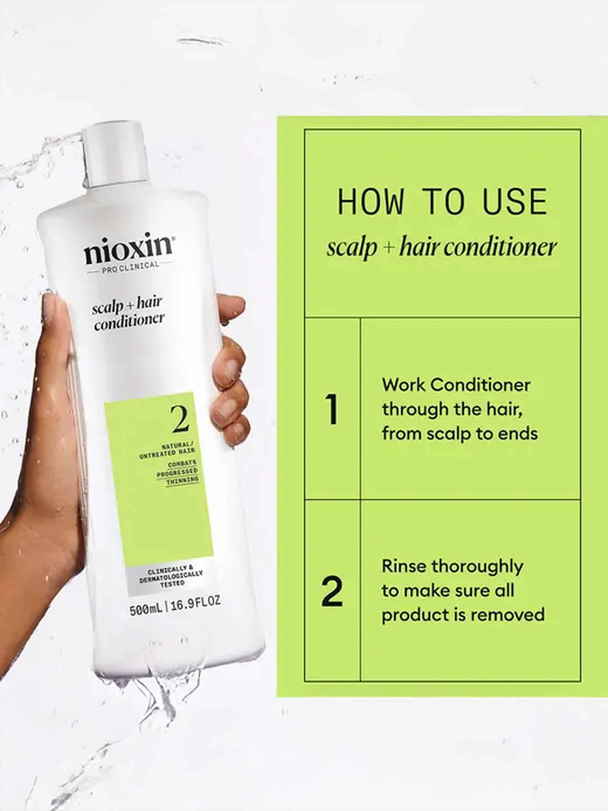 After cleansing, distribute product through wet hair and on the scalp. Leave on 1-3 minutes. Rinse well. Use daily. For best results, use after washing with the Nioxin System No. 2 Cleanser Shampoo.