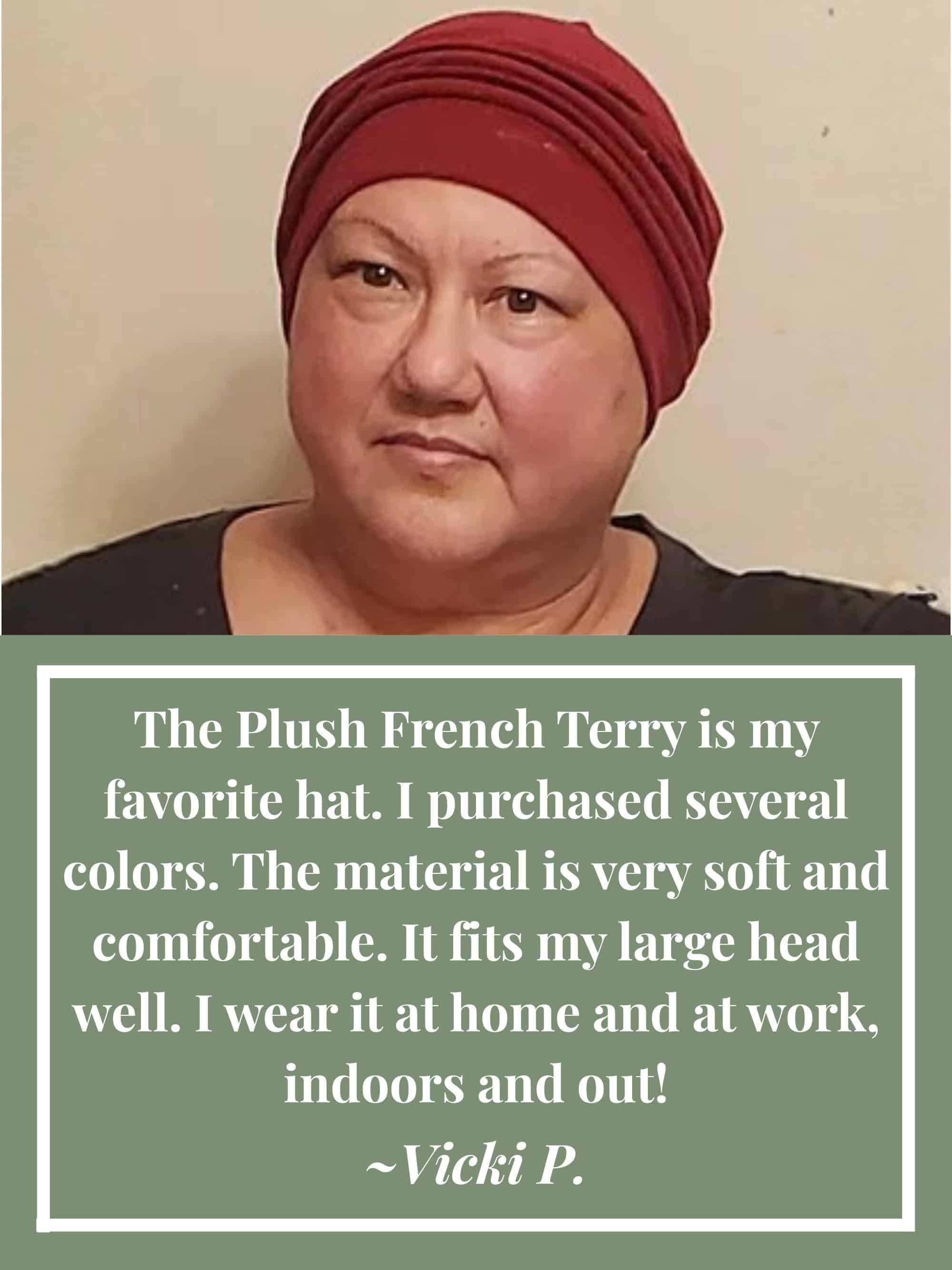 Much like our 100% Cotton Slouchy Snood, the Plush Terry Slouchy provides the wearer with full head coverage. The relaxed fit adds the perfect drape, giving the appearance of hair tucked underneath. Designed with very few seams, this hat is perfect for those with sensitive scalps due to hair loss from chemotherapy, alopecia, or any other causes.