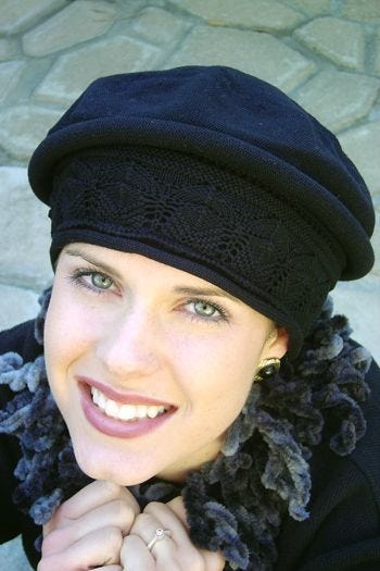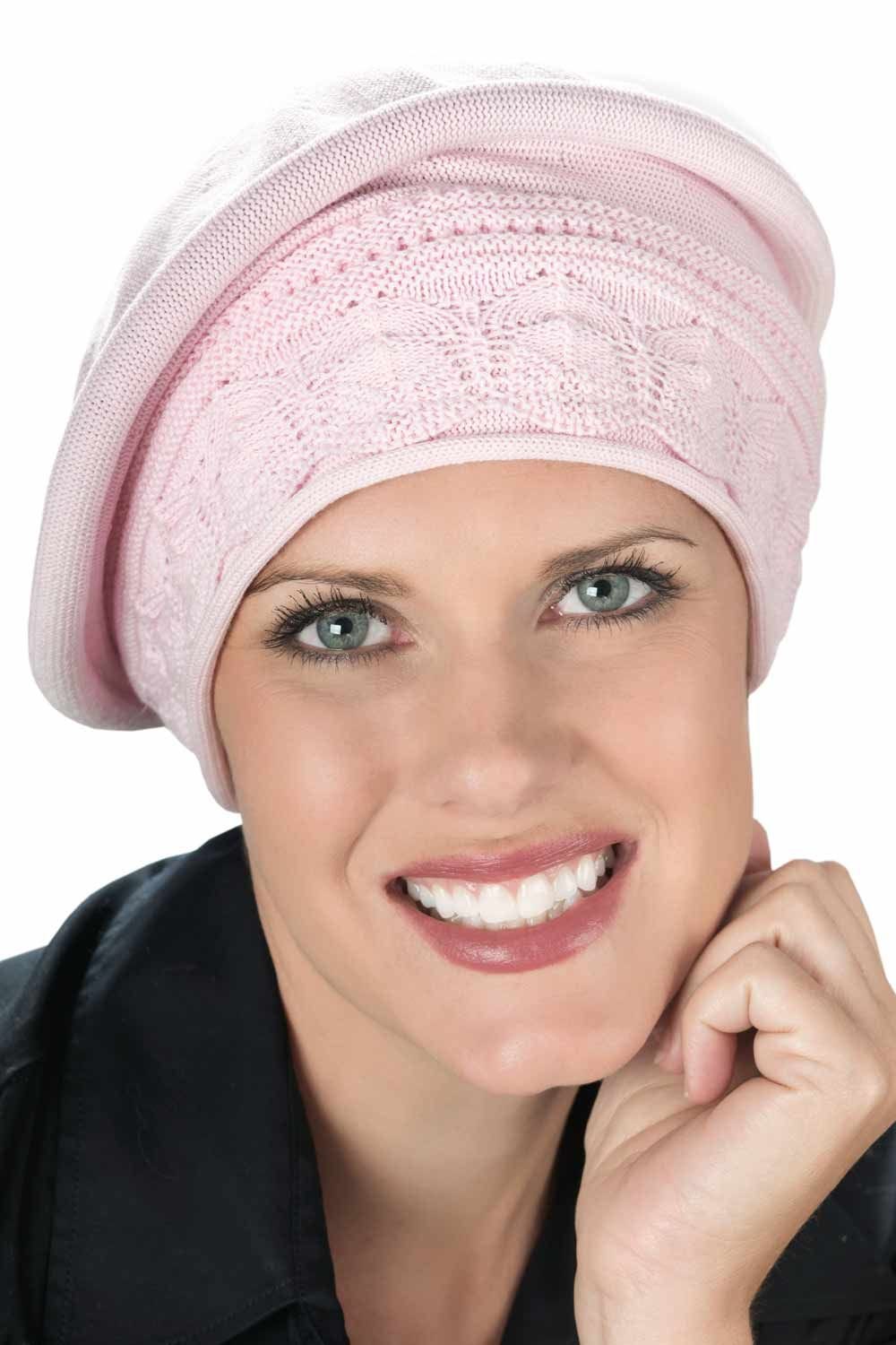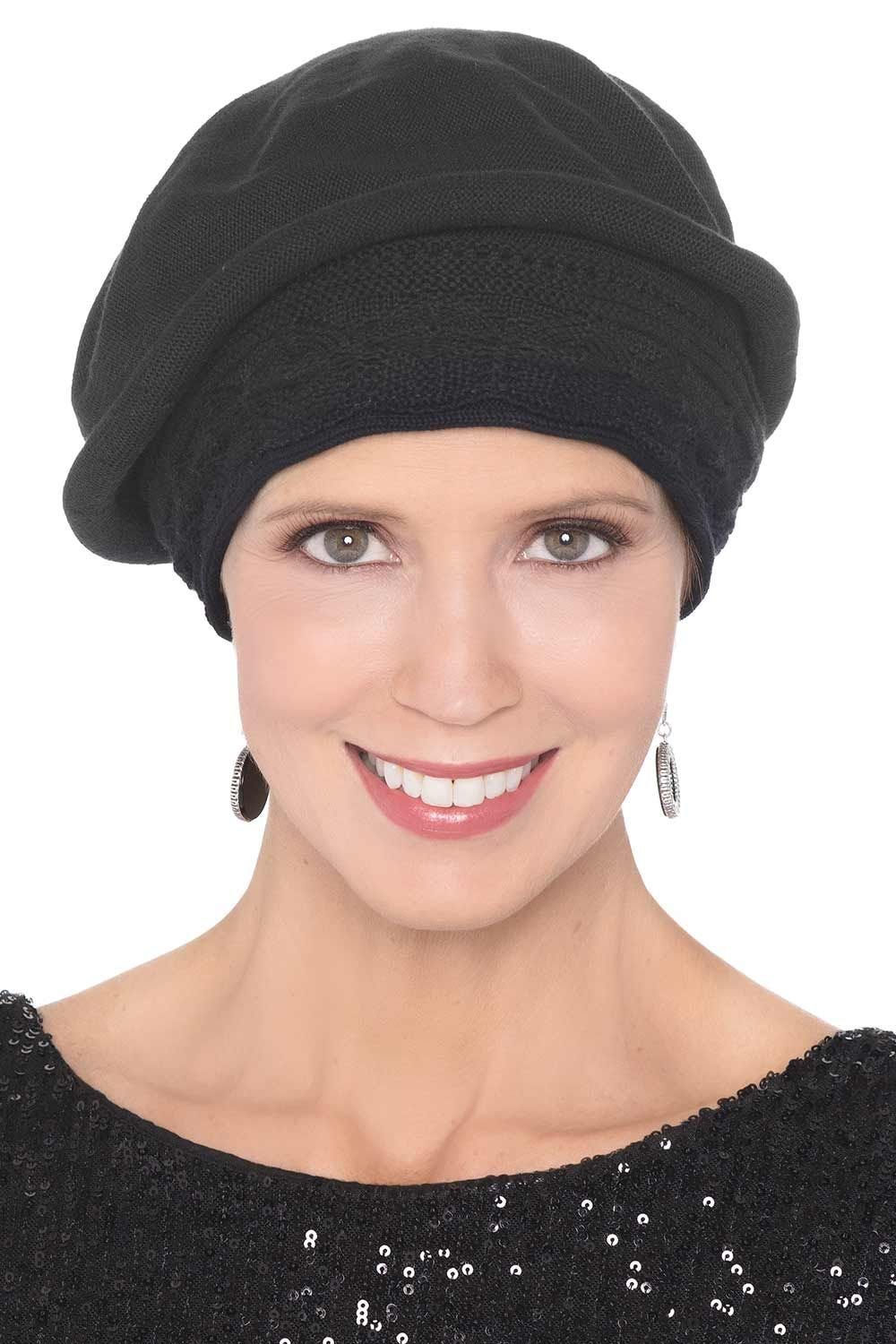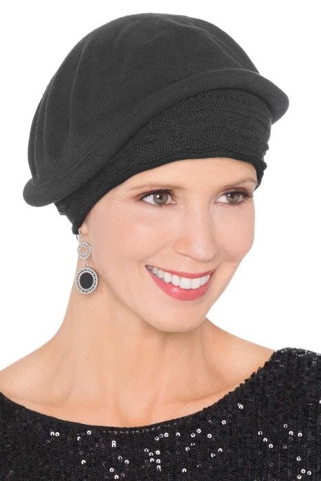 Our 100% cotton beret turbans are ultra comfortable, soft and stylish. With a form fitting, textured band that conforms to your head for a comfortable, yet secure fit. The beret style of this hat gives the illusion of hair underneath for a great way to disguise hair loss due to cancer, chemotherapy, alopecia, or other forms of hair loss, which is so often desired. It's got a soft feel that will be soothing on even the most sensitive of scalps. This one is a great choice for when you want a laid back look. It can also look dressy depending on what you pair it with. You will love the versatility of this amazing beret!