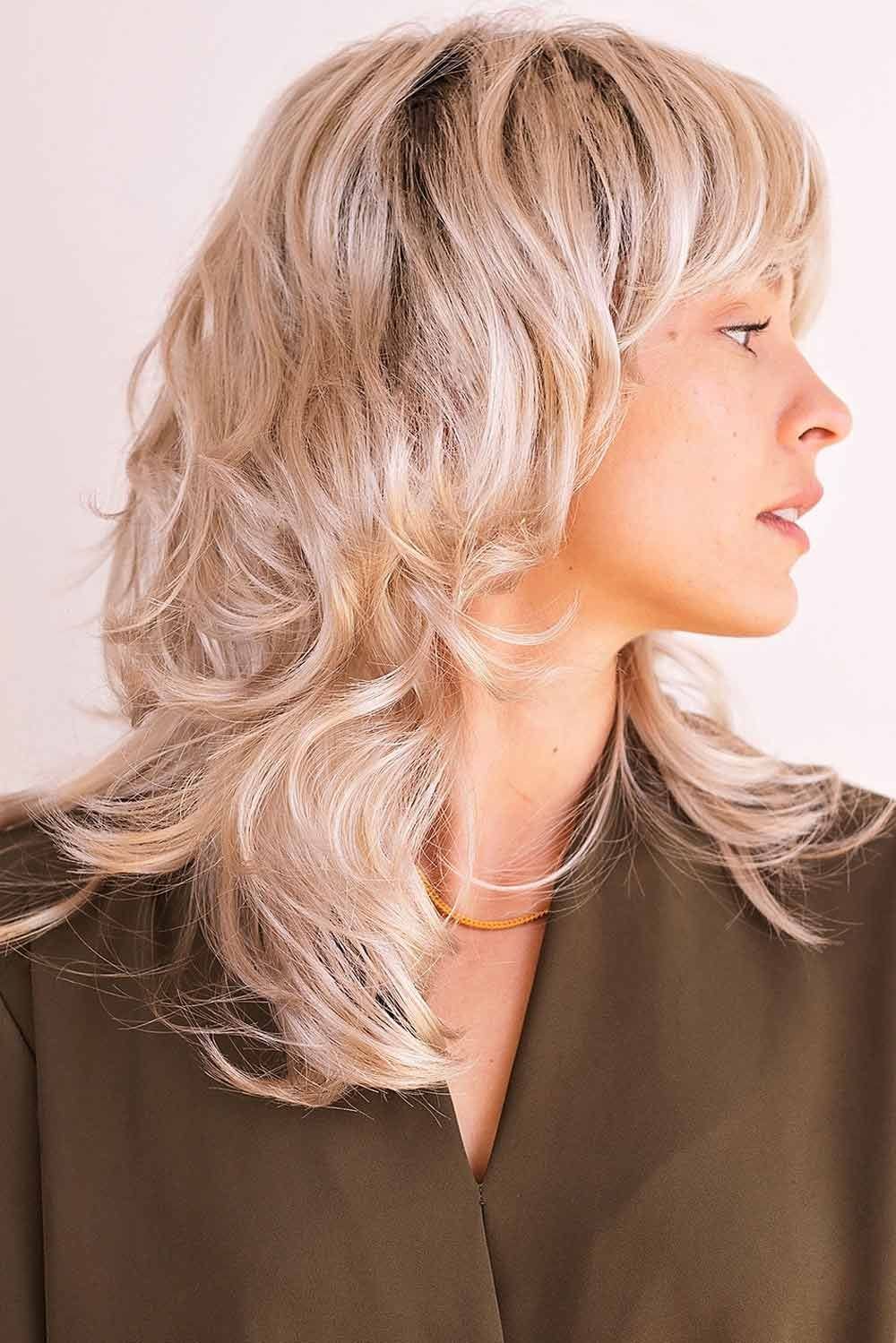 Soft, layered curls fall just past the shoulders in this medium-length wig, blending bounce with graceful movement. The overall length reaches about 18–19″, with gentle volume at the crown and layers that curve in softly around the face. A side fringe (around 4–4.5″) offers lift and openness, framing the eyes with a polished sweep.