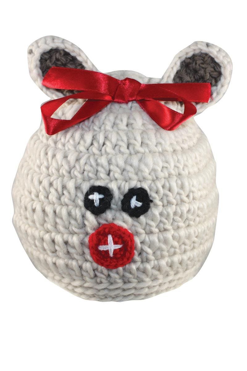 This adorable crocheted beanie is absolutely perfect for the holiday season! We love it for photoshoots, holiday parties, and so much more! It's soft, snuggly and supremely warm to help keep your little one from getting too cold when out and about in the winter months. The adorable reindeer design features ears that stand out from the top of the hat with crocheted button eyes and nose, and is topped off by a shiny red bow! This fun holiday hat is the perfect choice for your girl this season!