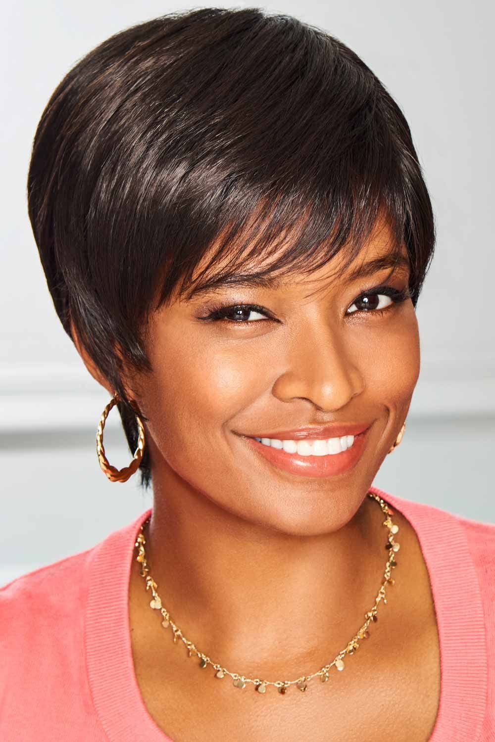This sleek and sassy look offers a delightful breath of fresh air to the typical pixie cut. The soft strands are face framing and curve slightly behind the ear while fringe bangs accentuate the natural beauty of your face. Renew by Eva Gabor Wigs contains several comfort features inside of the wig cap including open ear tabs and an open extended nape. The hidden inside weft gives this wig a natural looking hairline.