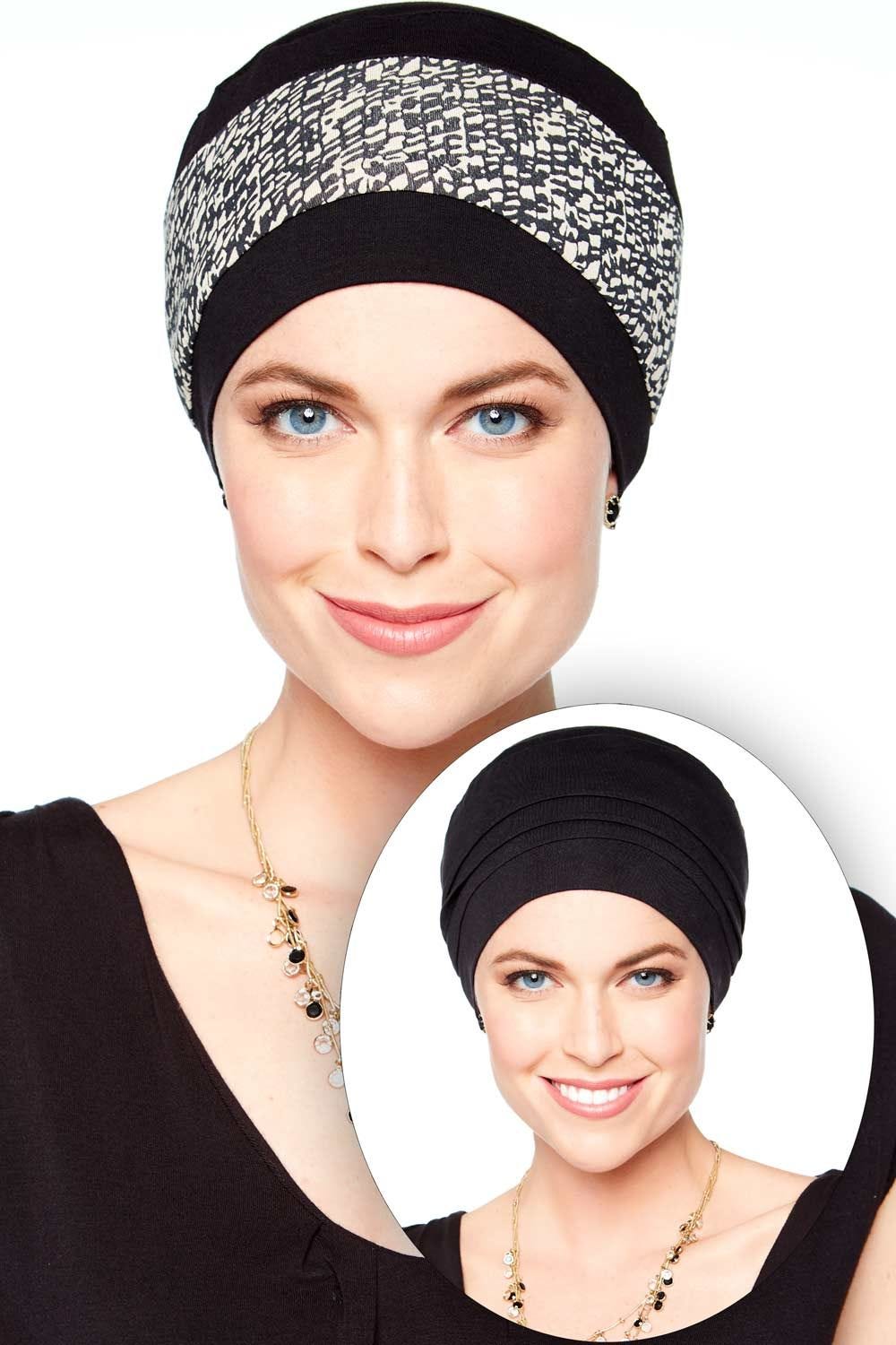 This fabulous beanie is reversible, offering you two looks in one! One side features a contrasting band around the center of the cap, while the other offers adorable pleated detailing in a solid shade. Our soft luxurious viscose from bamboo fibers will comfort your tender head in perfect comfort. We offer this gorgeous cap in several beautiful color choices, each featuring contrasting bands in varying complimentary fabric choices. Contrasting band fabric color and/or print is based on fabric availability. Pleating around the crown of this turban provide the look of flattering fullness, something that is so often desired by women with hair loss. This cap is soft enough for sleeping, but beautiful and stylish for wearing out and about with casual wear. We love it paired with jeans and a cute blouse or simple t-shirt. You can also dress up this look by adding one of our viscose from bamboo flower pins (SOLD SEPARATELY). Our Reversible Viscose from Bamboo Turban provides total head coverage for women with hair loss due to cancer, chemotherapy, alopecia or other types of medical hair loss conditions. It is also a fashionable choice for women with hair as well!