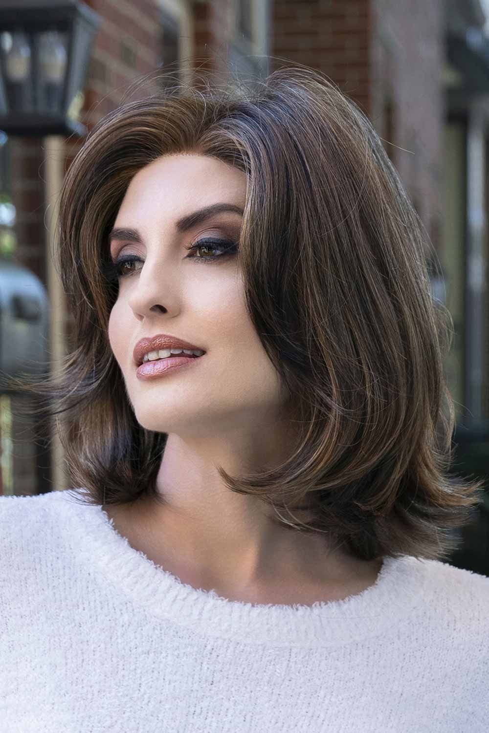 This shoulder-sweeping wig is cut into sleek, soft layers that gently curve under at the nape and outward at the sides, reaching about 10″ from crown to side. A side-swept fringe (≈5½″) grazes the cheekbones, guiding the eye and framing the face with effortless ease. The silhouette feels salon-fresh and tailored—structured enough for polish, but soft enough to feel like you’ve just run your fingers through it.