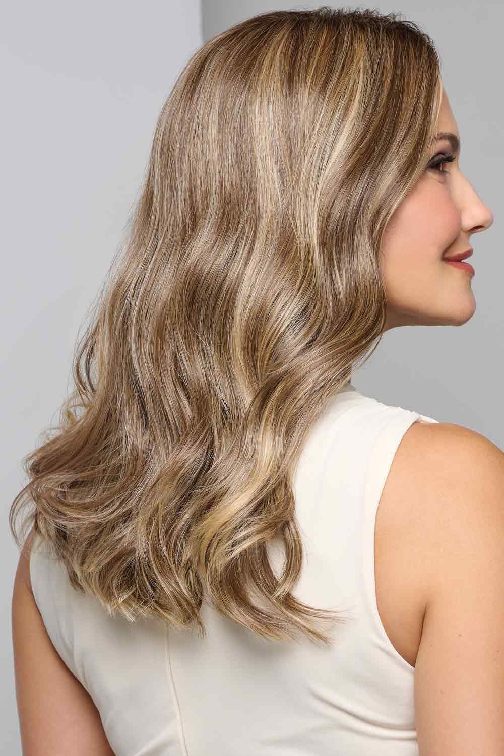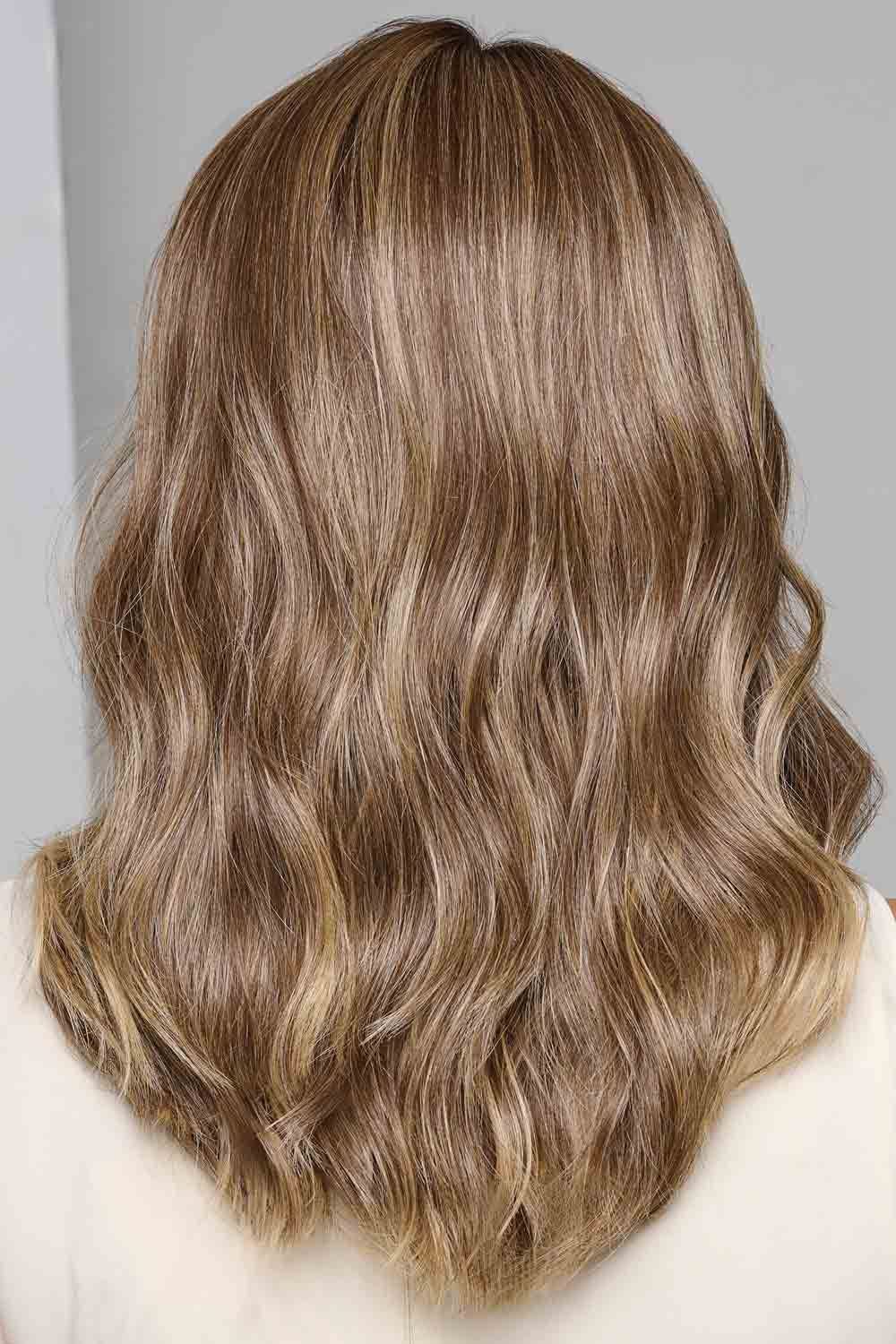 It falls just past the shoulders in soft, feathery layers that ripple with gentle fluidity—like a breeze-but-better version of your hair. The waves are relaxed and romantic, flowing with a natural texture that skips shimmer but carries a subtle, realistic sheen. Around the forehead, a lace front drapes from temple to temple into a full monofilament top—so off-the-face styling, middle parts, or side sweeps all look effortless, as if the hair truly grows that way. It’s a heat-friendly wig, but you’d feel more like it’s a hair day, not a wig day.