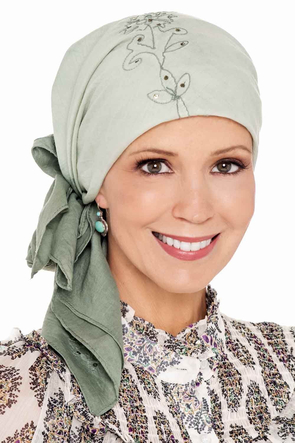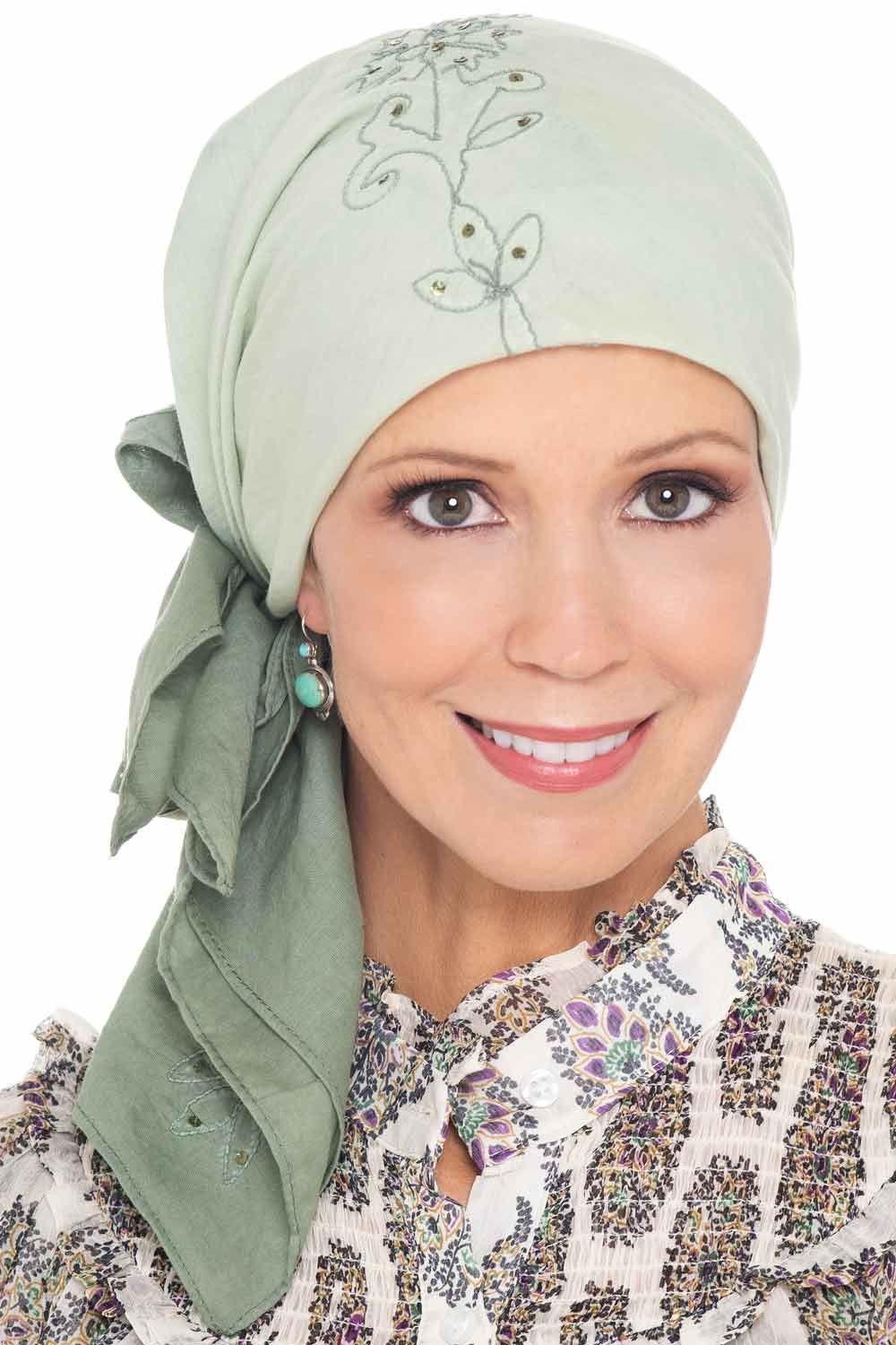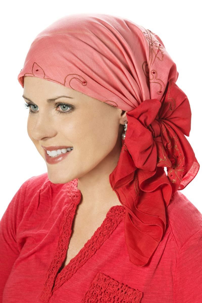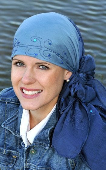 Our tie dye head scarves just added a touch of glamour. We've added sequins for a touch of elegance. The original tie dye pattern has been designed so that the tails of the scarf are darker in the back, for a truly "put together" look. Embroidered floral detail is hand appliqued throughout the scarf. Free scarf tying instructions are included.
