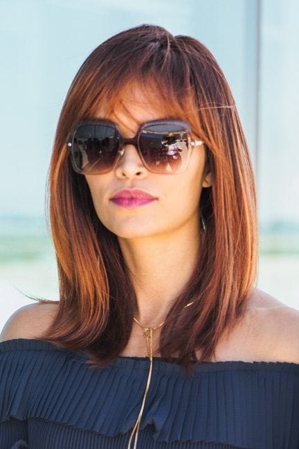 This mid length style boasts face framing tendrils that are parted on the side. Subtle layers and wispy bangs frame your face beautifully, while the straight, flowing strands cascade past your shoulders. It's a fuss-free synthetic wig that keeps its shape wash after wash - just shake, style, and go!