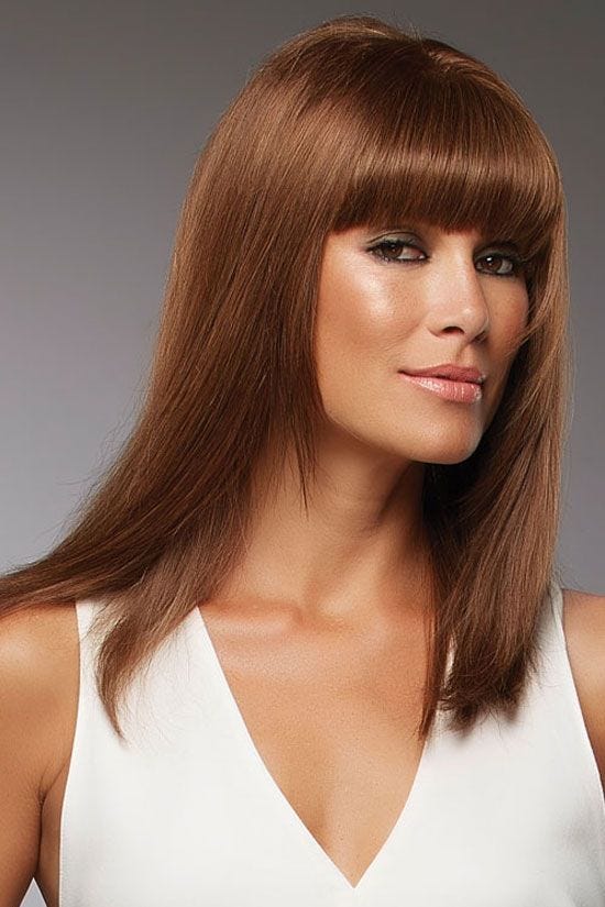 Sienna provides luxurious layers and is absolutely lovely! Full bangs give this wig an alluring look that is oh so fashionable. This SmartLace wig, made from heat-stylable, top-quality 100% remy human hair. Lace-front and monofilament construction, gives you control and the ultimate natural look. This monofilament wig features a long layered silhouette that can be parted in any direction. It also showcases an undetectable lace front for optional off the face styling.