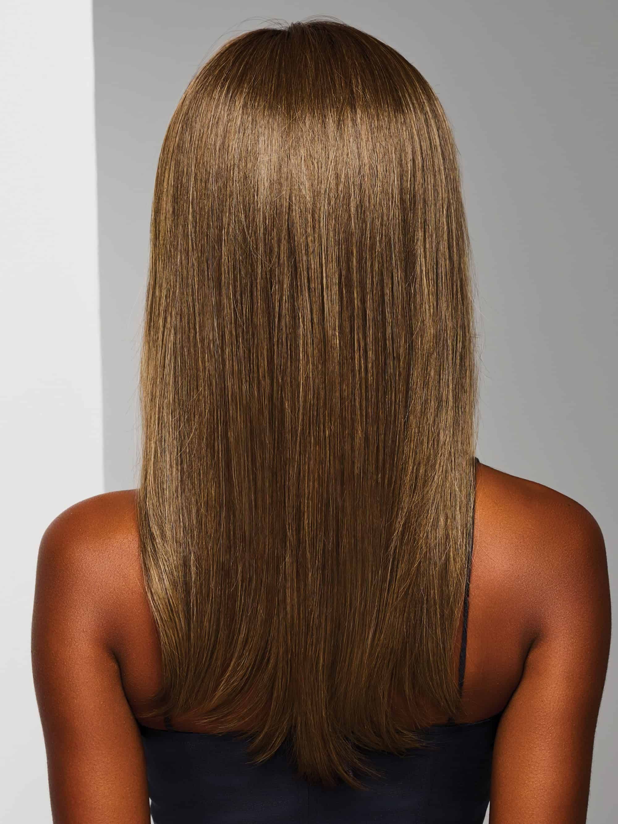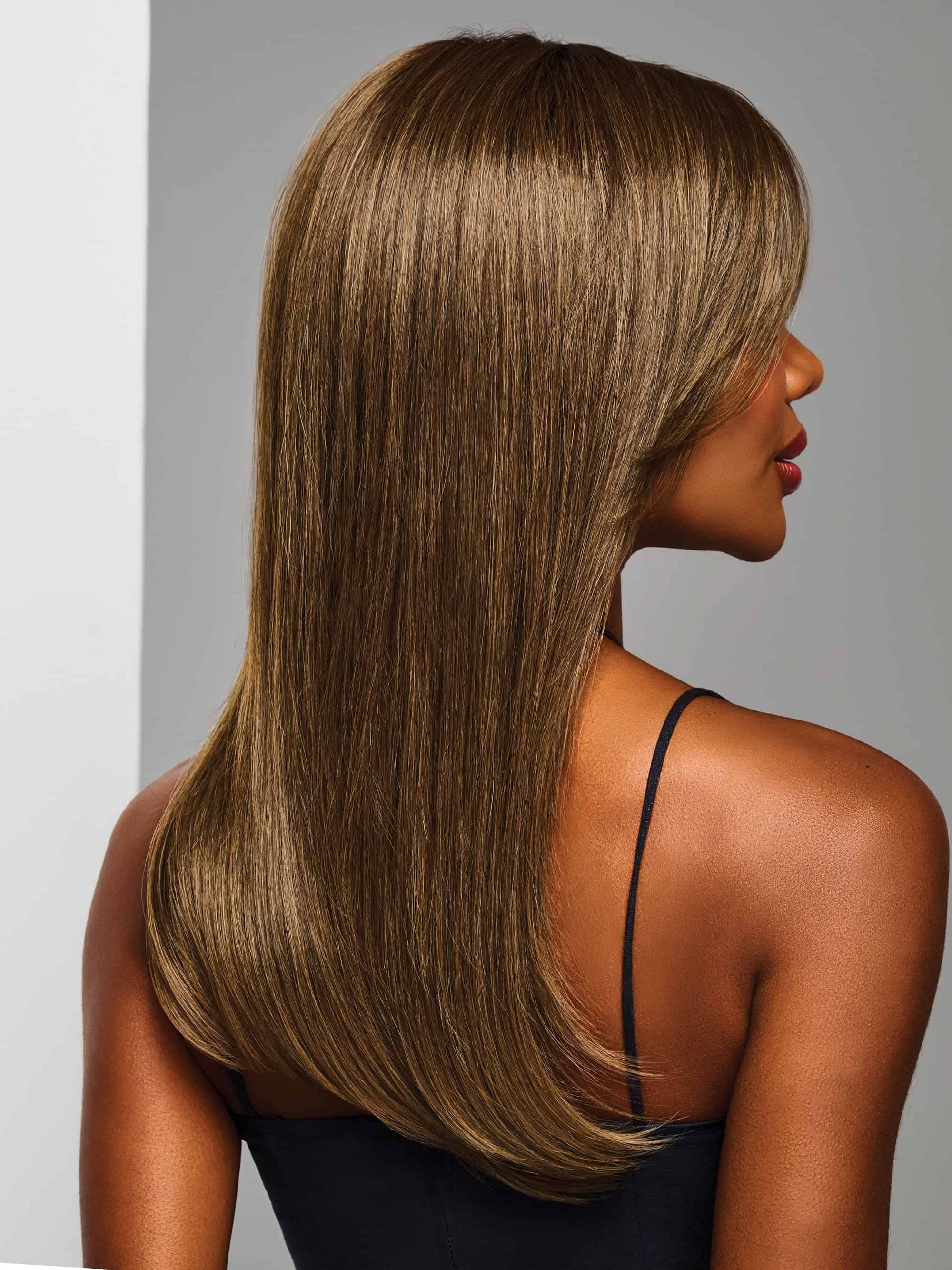 Sleek Sophistication is a long and smooth style, falling well past the shoulders. Face-framing layers form a modern curtain bang that blends naturally through the ends. The monofilament part allows the hair to look believable close up. Heat-friendly fiber gives you the flexibility to add a soft bend or flip the ends under without a full styling routine. Velvet details along the hairline, ears, and nape keep the cap comfortable and secure through daily movement. This is a supportive option for days when styling feels like too much. Easy to wear, steady, and dependable.