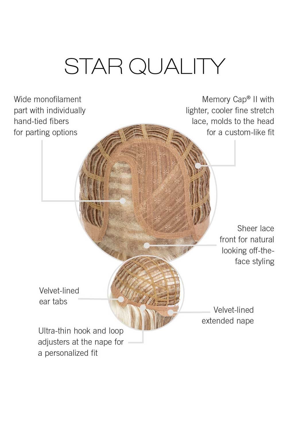 Star Quality by Raquel Welch is a straight, long, layered cut with optional side swept bangs. This feminine silhouette features a lace front for optional off the face styling and a Sheer Indulgence monofilament part.