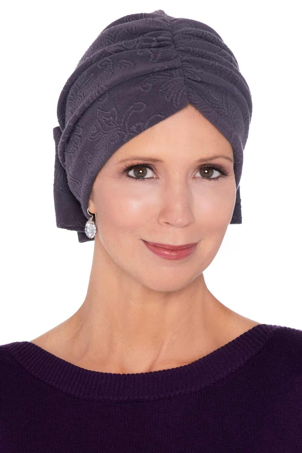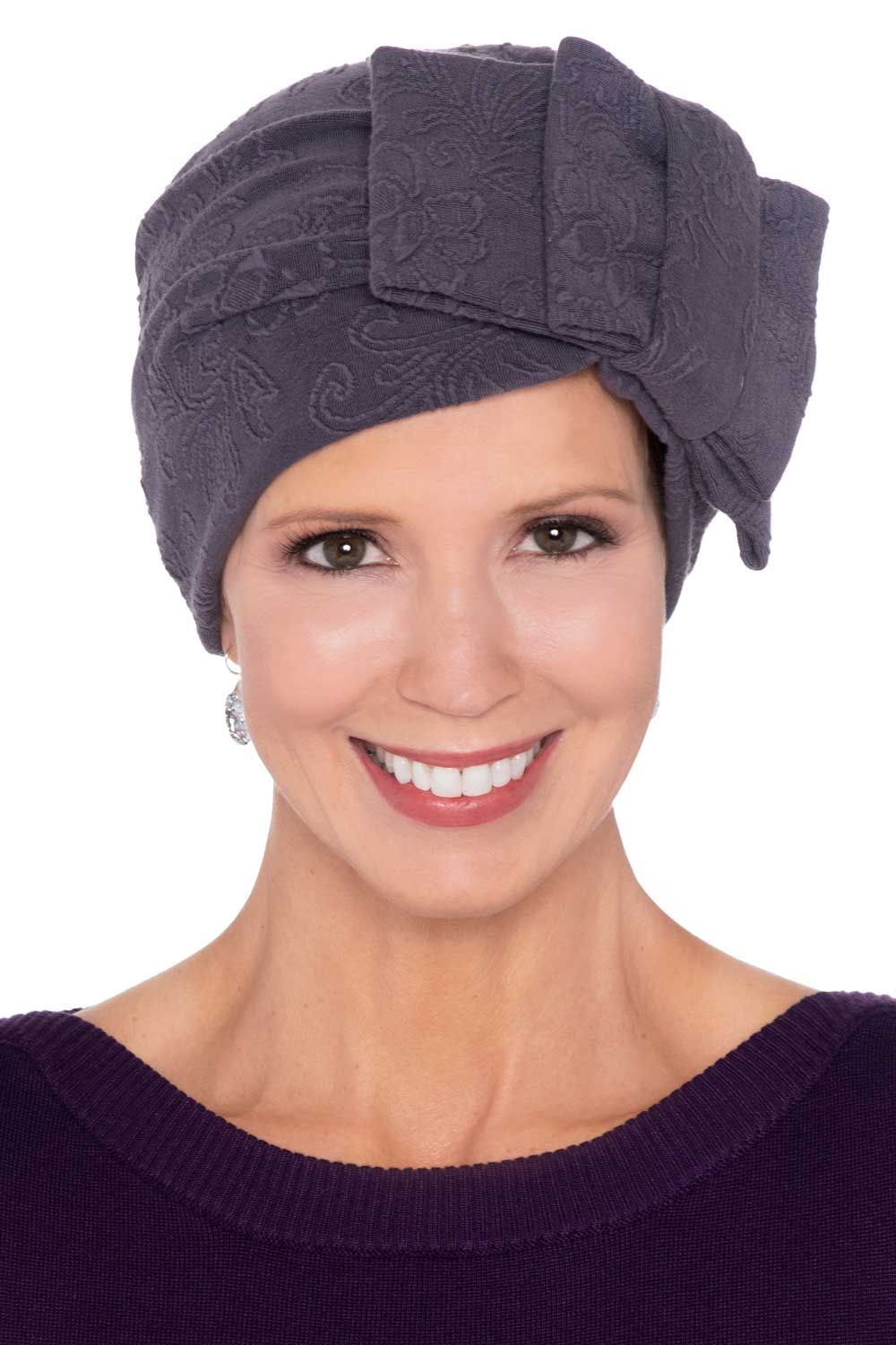 This stunning style offers a vintage look with a contemporary twist. Constructed in a classic turban shape, the Lilian Bow Hat is adorned with a gorgeous oversized bow on one side and timeless gathering on the other to add a touch of flair to any outfit. Wear this hat with the bow to the front, side, or back for three distinct looks. Made in our stretchy textured fabric, the Lilian hat provides an exquisite, comfortable fit with all the body and fullness you want from a turban. Lined in superbly soft and gentle bamboo viscose, this nearly seamless cap is cooling on the scalp and wicks away moisture for the most comfortable feel imaginable.