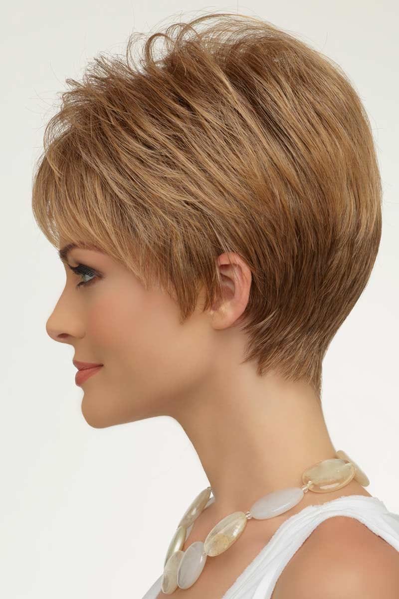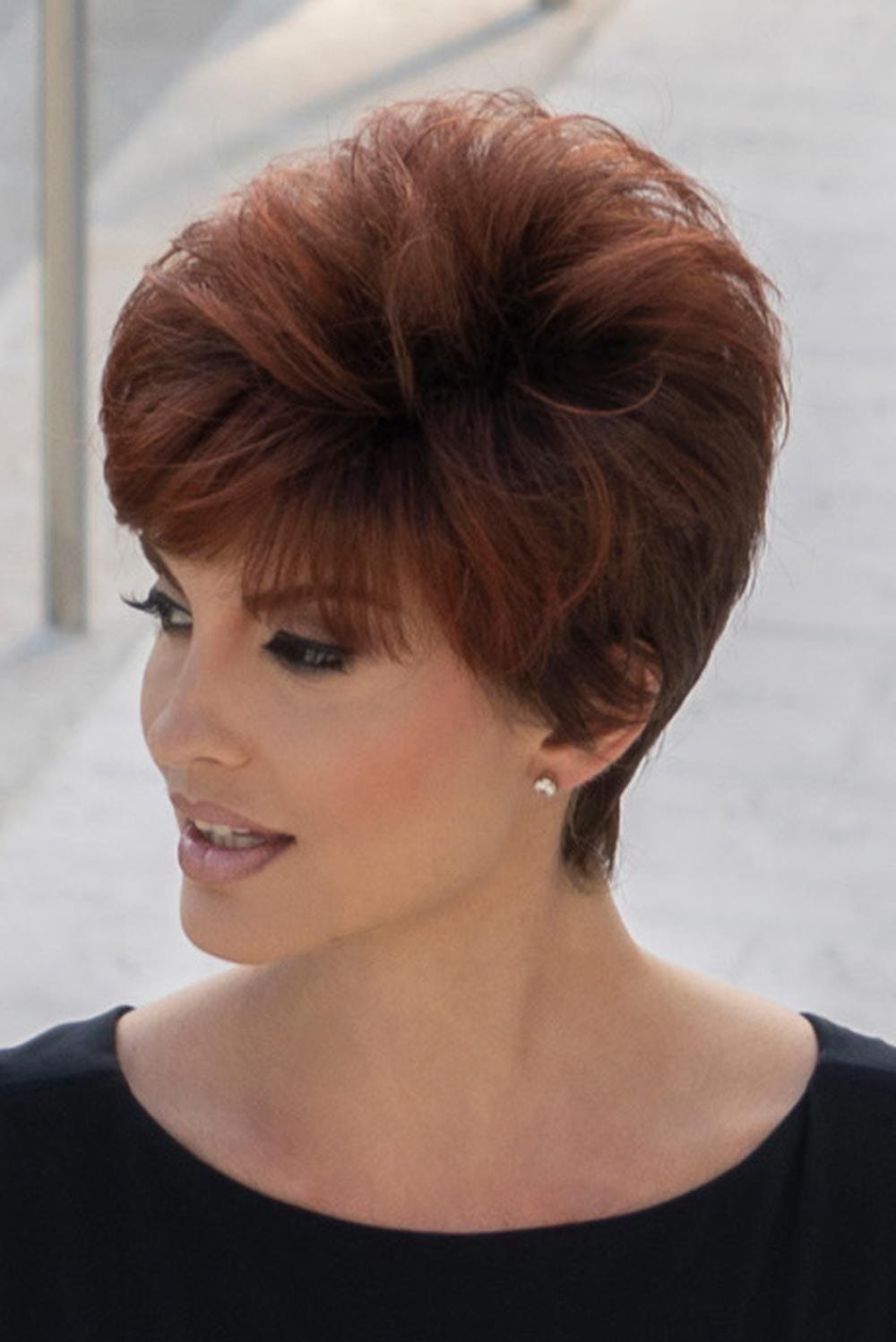 Full bangs skim the brows while softly layered strands add natural lift at the crown. The sides taper neatly toward the cheekbones and blend into a clean, contoured nape, creating a pixie that feels structured yet easy. Tiffany is a short cut designed to frame the face in a flattering, feminine way — modern, breezy, and always put together.