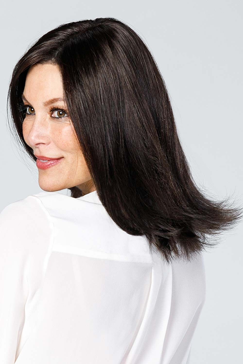 The medium‑density fibers have a soft, natural texture with just the right touch of natural sheen—not glossy. Three discreet pressure‑sensitive clips, plus a polyurethane tape tab, keep it secure without pulling or flattening your own hair. It’s built thoughtfully: hand‑tied into a stretch‑able base that flexes with your head, giving lightweight comfort even during long days. If you’re tenderly adjusting to hair loss or thinning, this topper supports your journey, helping you feel like yourself—only a little fuller, a little more at ease. Also available in an 18" length.